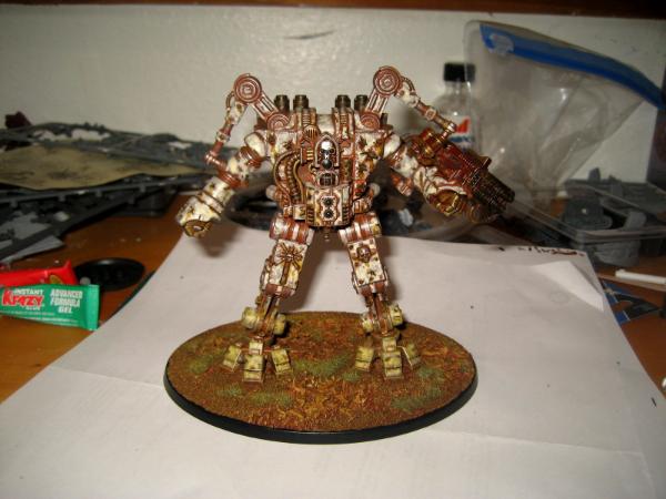When that was all done, I did a light drybrushing of bubonic brown (an old GW color, 2-3 'versions' ago...back when they had hex-pots) on the lower third or so to represent dust.