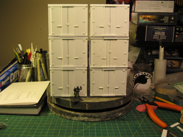 I love me some shipping containers too but they're a pain to make. I've created a master of a 40K scale shipping crate but can't really produce them at the moment. Making them a solid block out of resin would cost way too much and doing them out of plaster makes them too fragile.