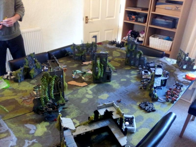 Things don't seem to be going well for Dave at the moment. He has lost his mobility and his Wych units are pinned down due to the gap of open ground between my Grey Knights and them. Though he's not out the game yet, he's keeping the Wyches at bay so they can move out and contest objectives nearby later.
