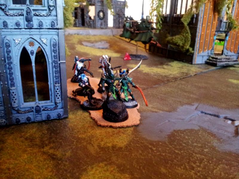 Ok, I think I've got off to a very good start. Two Ravagers are down and the other is stunned, this will buy me some time from lance fire. Both Wyche units are down and as long as I keep firing at them they won't have any significant impact in close combat, plus where they are positioned means they have to cross open ground to reach my lines.