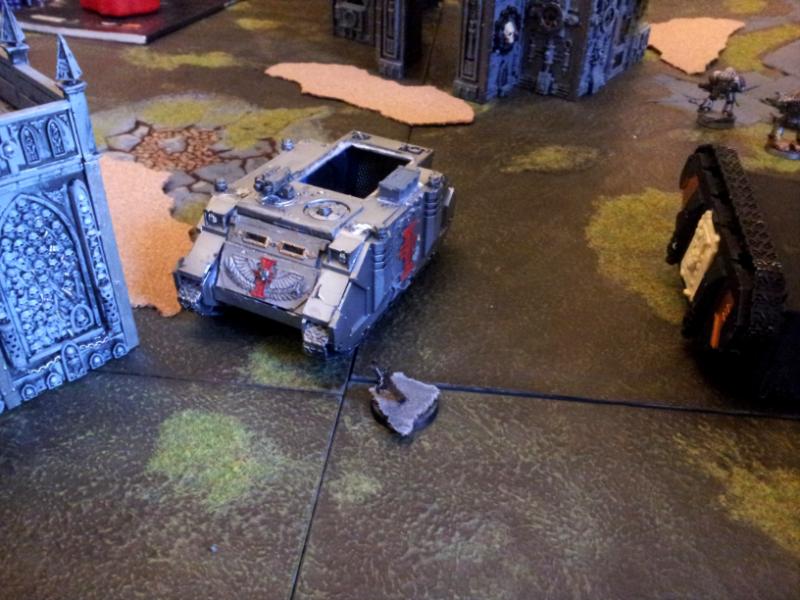I deploy in the bottom right corner and use my slow rhino 2x3 formation, Dreadnoughts go behind with the Interceptor unit on the hill far back. Crowe takes cover in a LOS blocking ruin.