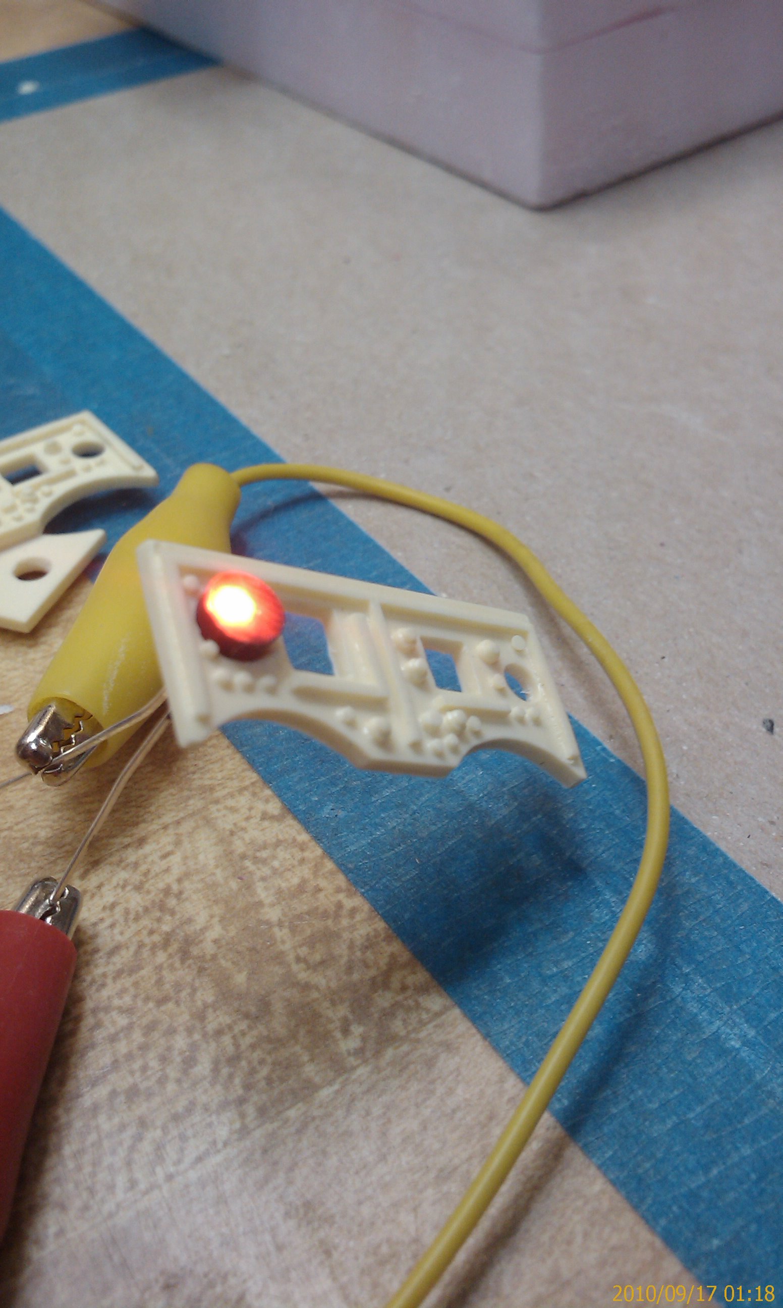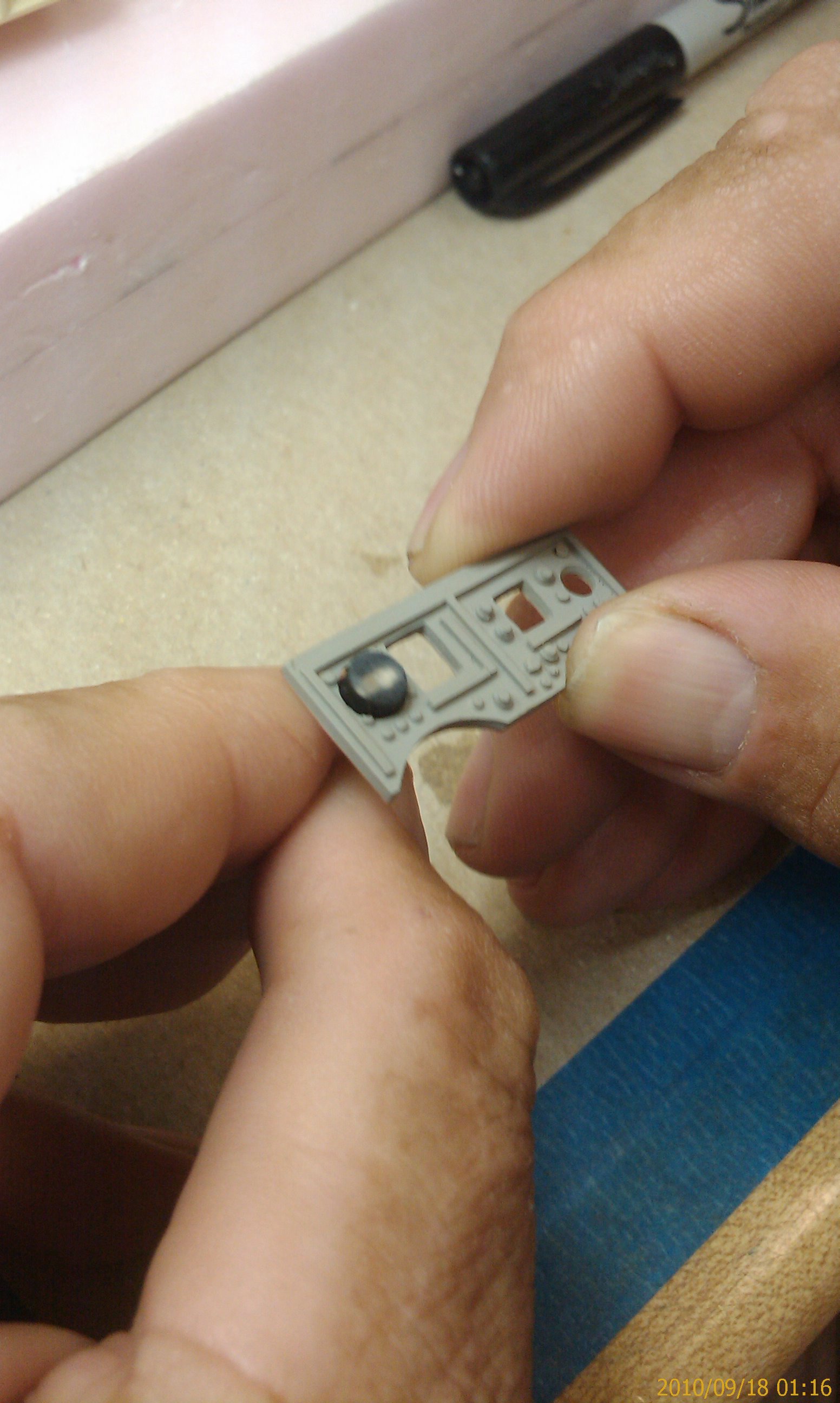 Hyenajoe - Thanks!! That's right you read the title correctly there has been some paint applied to the warhounds, but first some more updates. We switched from a 9v power supply to 4 AAs as it would be easier to solder differing currents but this of course created a problem with the new connector for the cool swapable guns. So we had to add a spacer to the connector. Of course you can't build just 1 connector spacer so here's the other 3. The bolts will be shorter when it's really installed, I just used larger bolts so it was easier to line them up for test fitting. Next up it's time to paint the dash board so the lights can be glued in. It's the first step on the road to finishing these beauties! I found a nice Tamiya gray and loaded it into the air brush, after a nice even coat the cut off led was inserted for a quick picture before setting them aside to dry until tomorrow night!