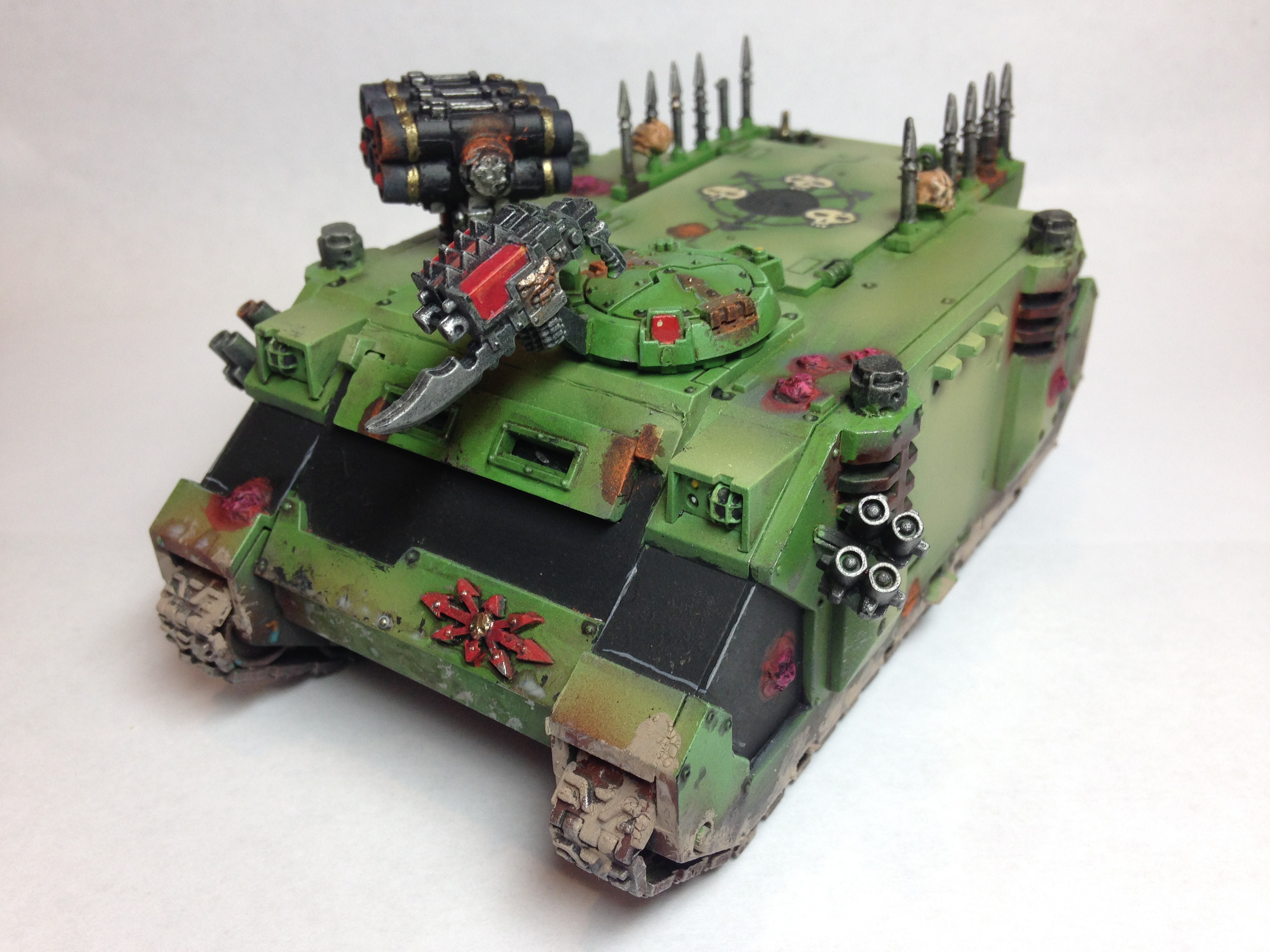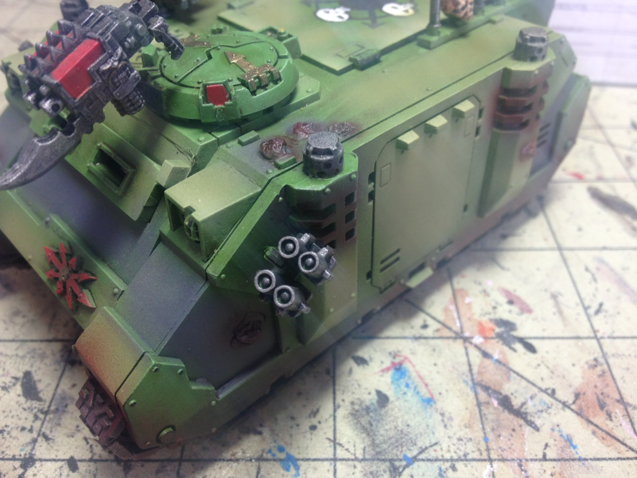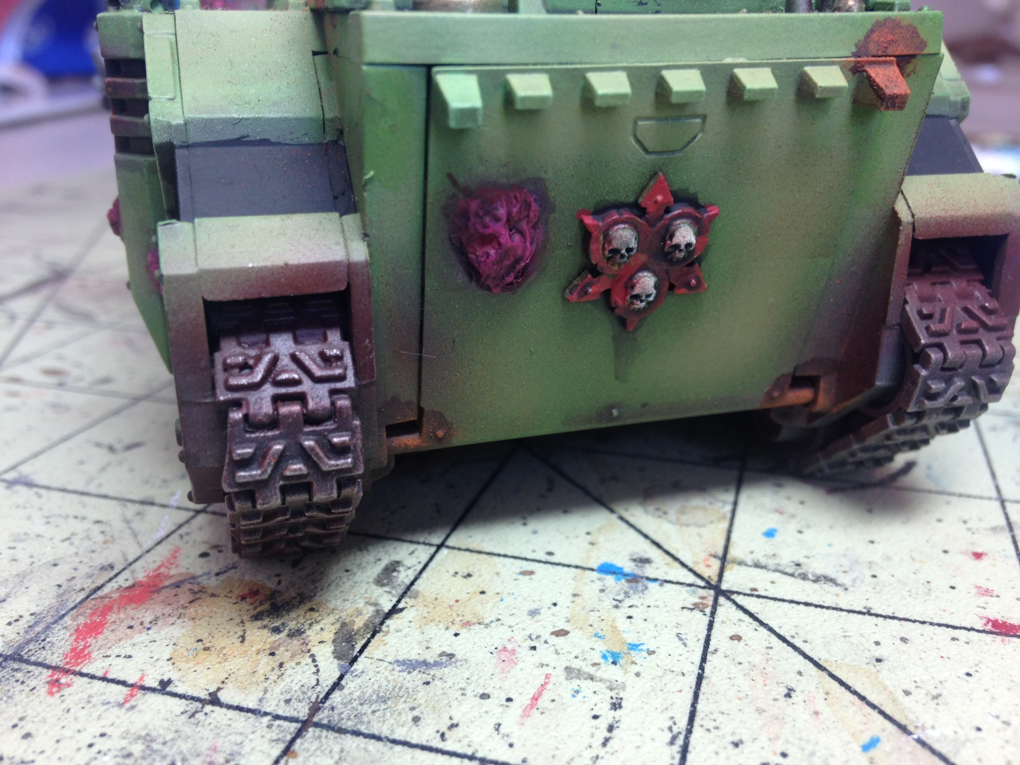 Added a few pustules using pva glue covered with superglue. Airbrushed some nurgles rot over the panels then lightened it up with some Vallejo sand. Dirtied up the tracks and around the bottom of the rhino along with the blisters.