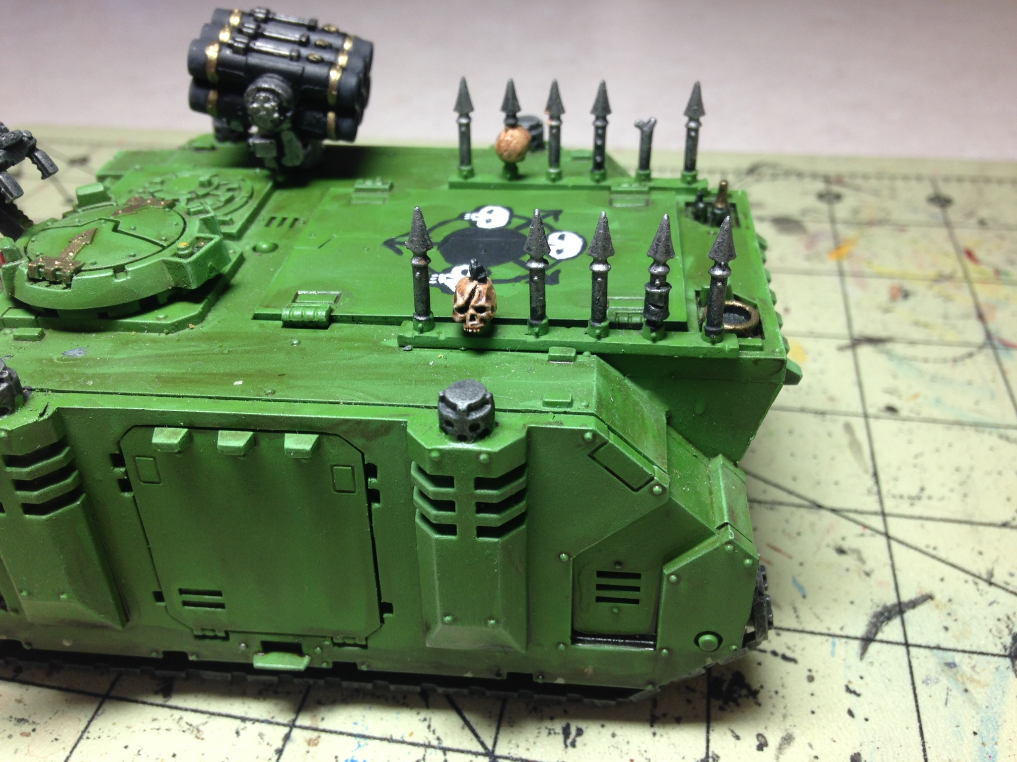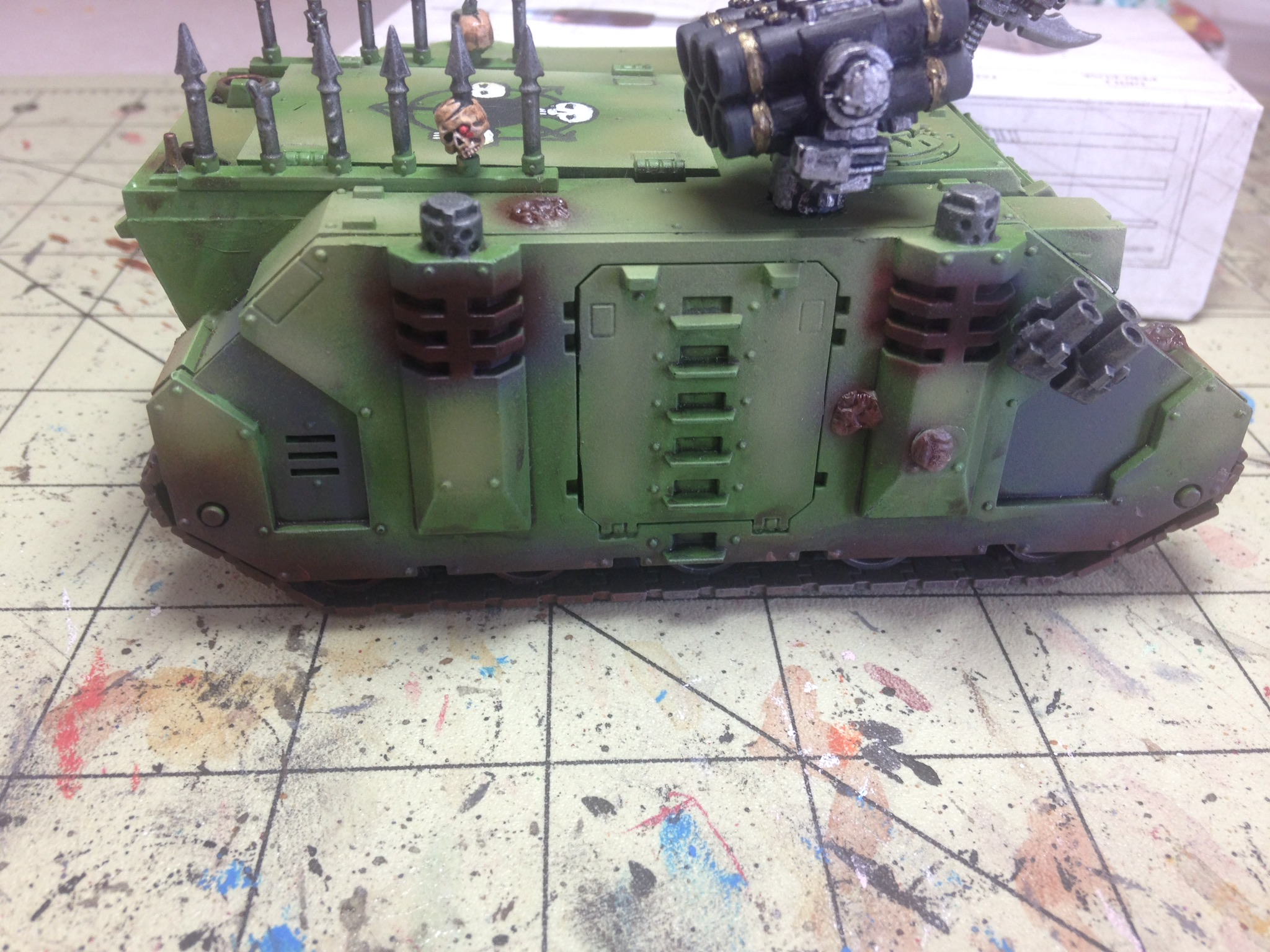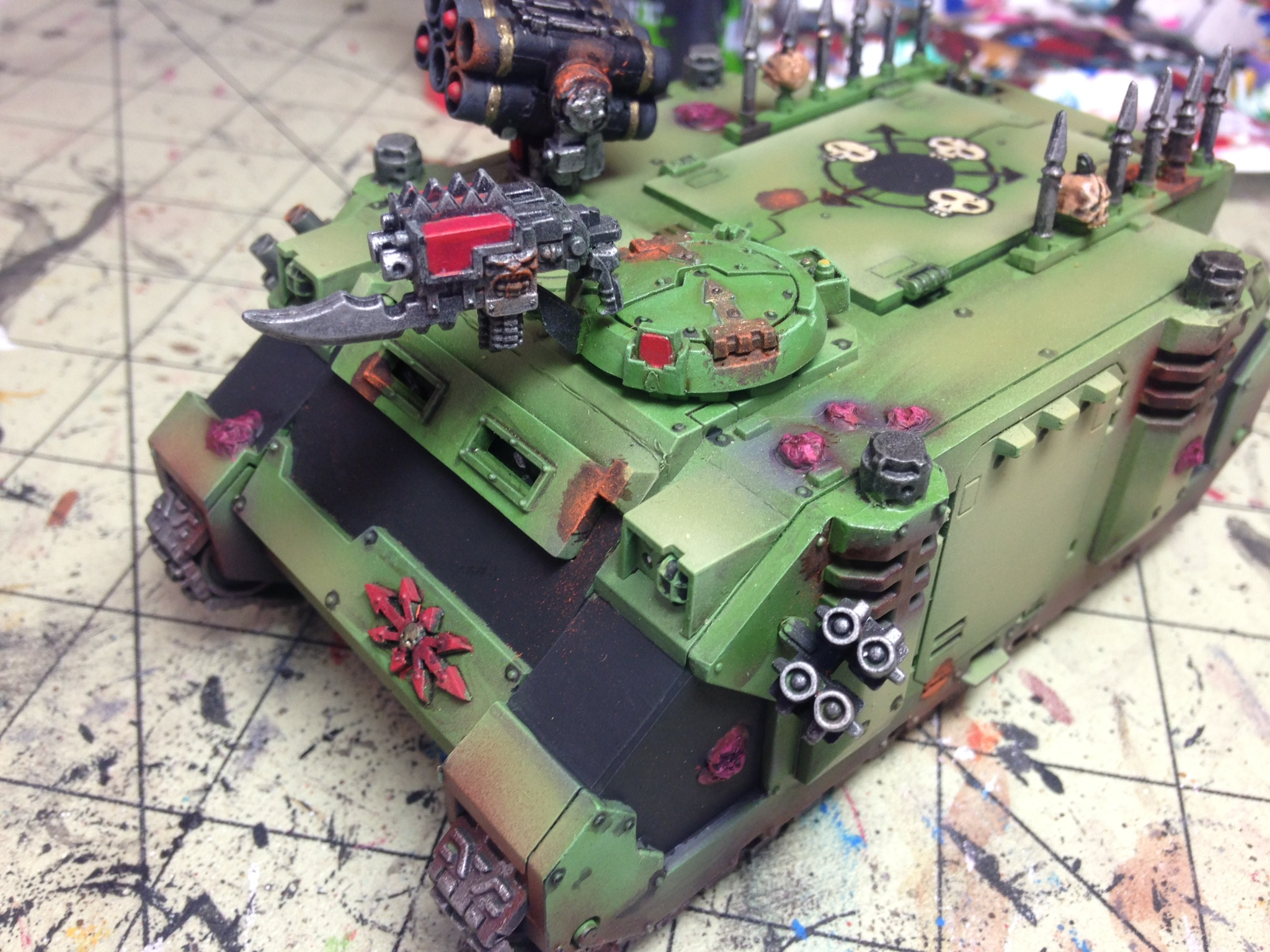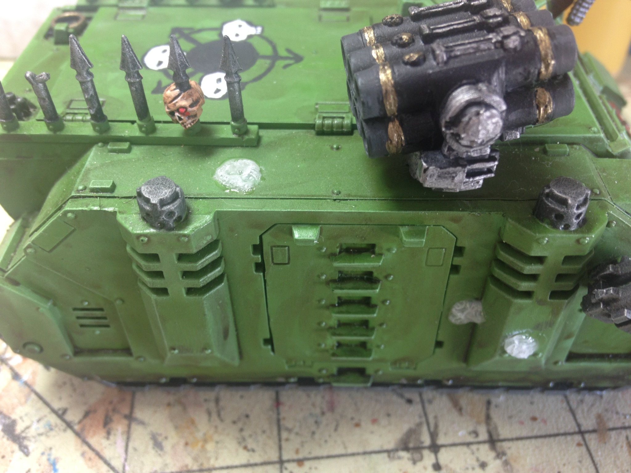 Added a few pustules using pva glue covered with superglue. Airbrushed some nurgles rot over the panels then lightened it up with some Vallejo sand. Dirtied up the tracks and around the bottom of the rhino along with the blisters.