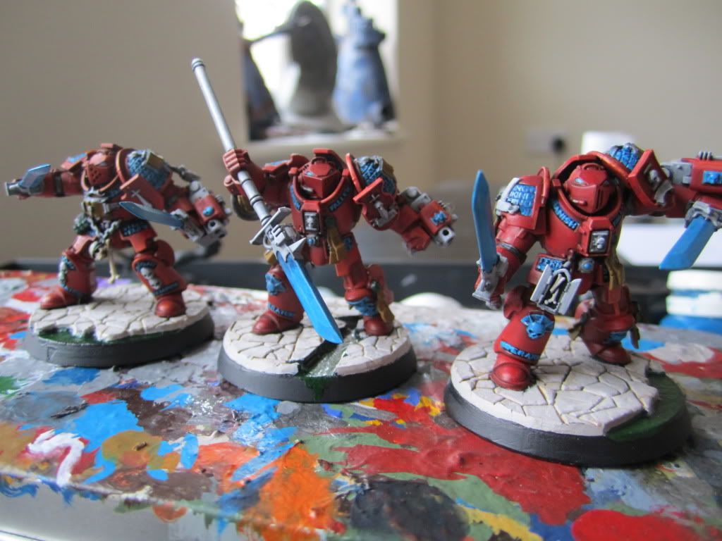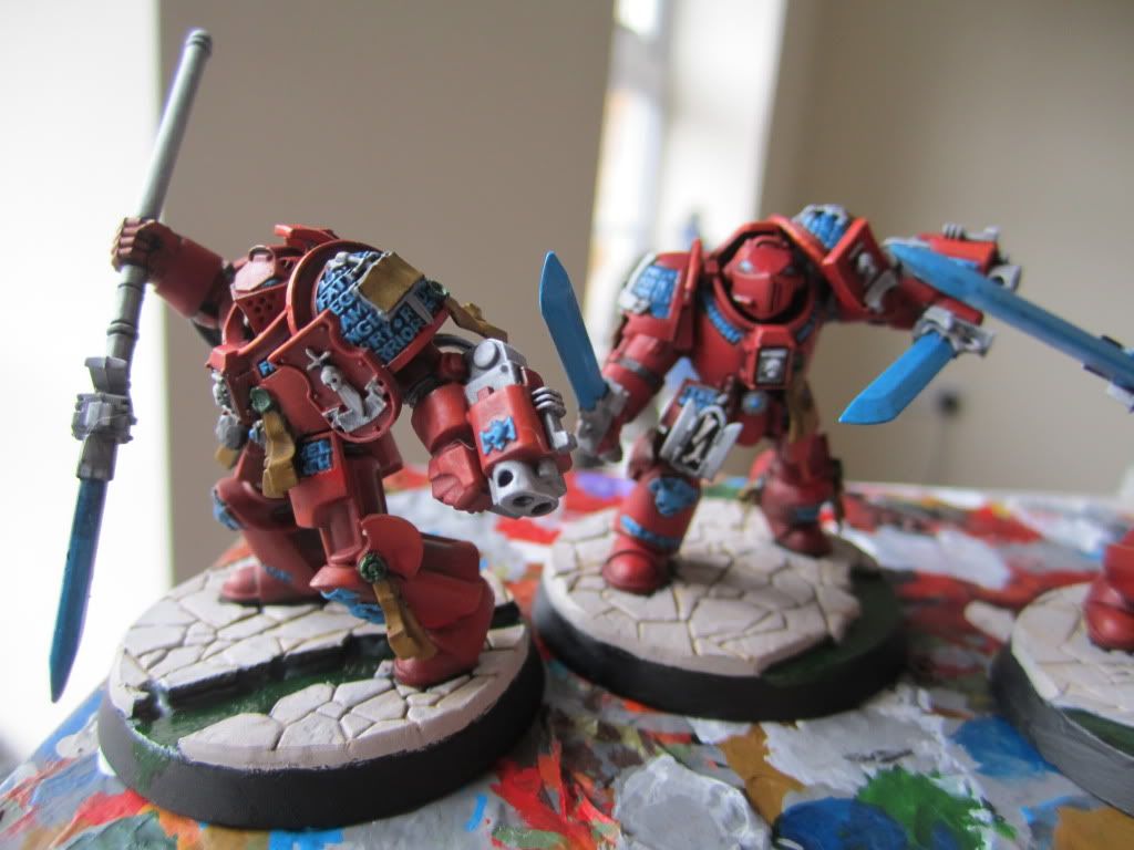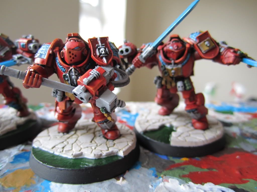I must say I'm jealous at how clean and crisp you colors came out. Very nice indeed. I have a painting & modeling blog up where I have been painting Paladins red as well. Check it out if you get a chance. A few suggestions, first mold lines. Try to get more of them off before painting. I noticed your guy the the Halberd has a few still on his weapon. I don't know If you plan to, but a wash and some highlights add so much more detail to a model. As someone else mentioned here and on my thread, using green for force weapons and helmet lenses really does tend to go a long way in terms of how interesting a model can look. Overall, good job!