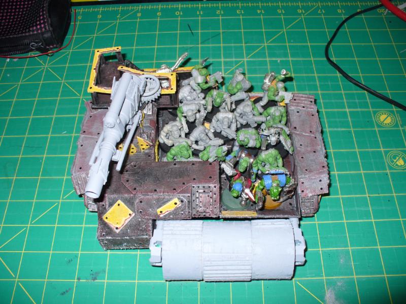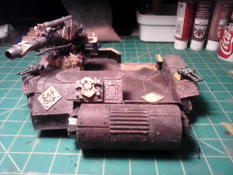 Still missing the co-driver on top, some final details and some grots or boys operating the cannon but now featuring twin-linked big shootas and "EAT DIZ"