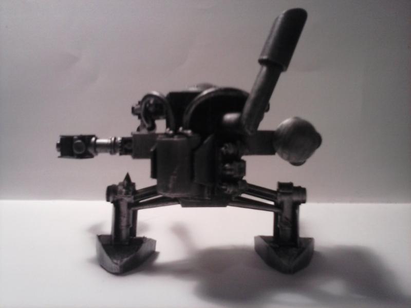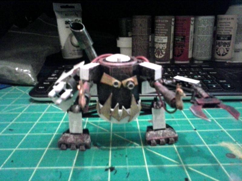 I really had no idea how big he should be but I figured the torso should house a grot or ork in a fairly tight "cockpit" and then scaled the legs and arms to fit that.