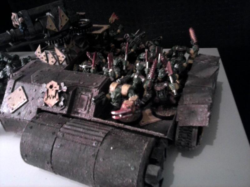 Just a little update here... I found a little free time and painted my mob of 16 sluggaboys and added two glyphs to the battlewagon. I have yet to paint and place the two skorchas I´m putting on either set of tracks along with a few other details to finish off the build. I know this pic is´nt very good quality but you should get the impression