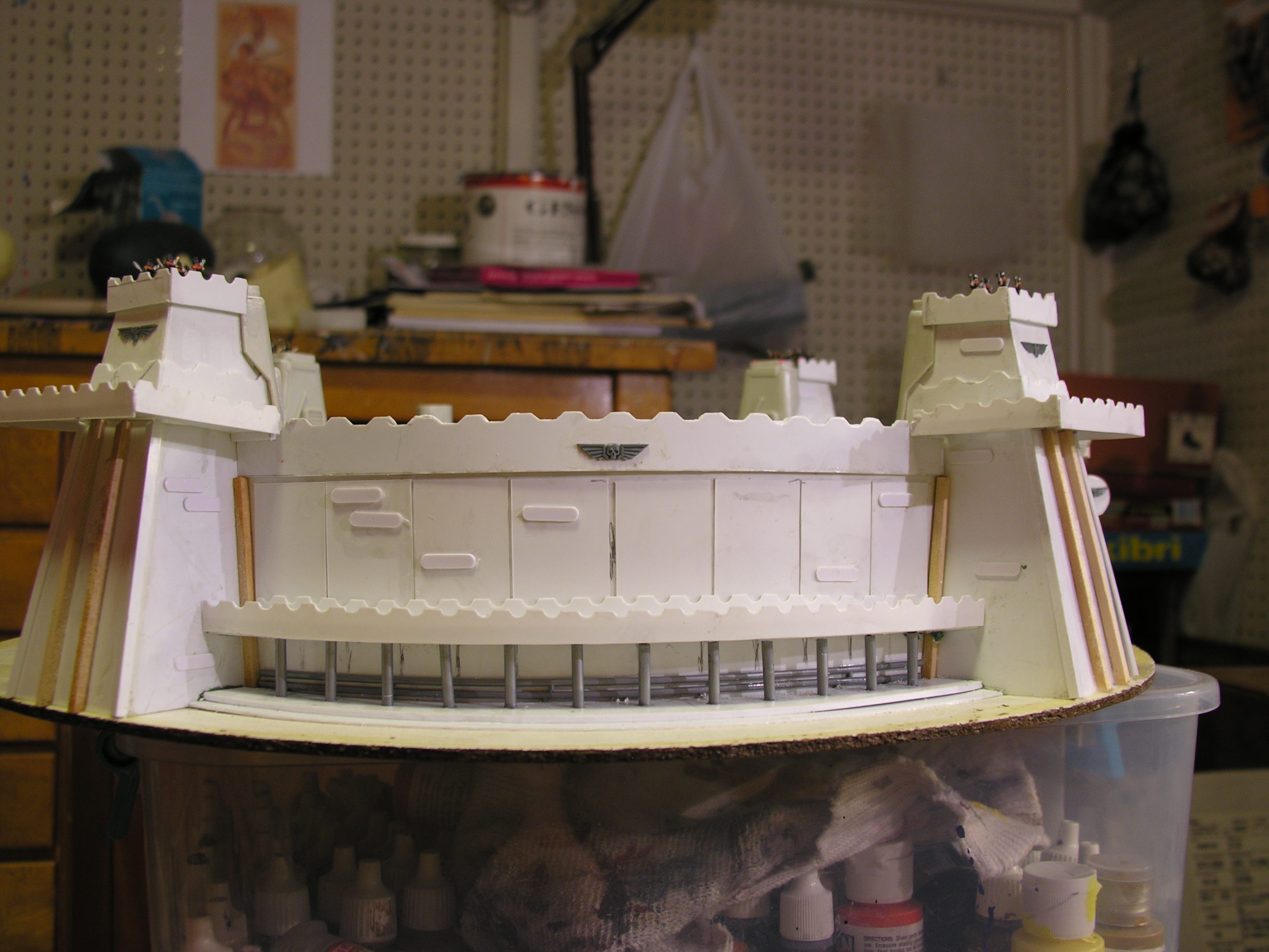 The defense laser is on a lazy susan and spins freely. Next step - paint. Tons of concrete colors with wear and tear. after painting the lase will be mounted in the emplacement and a final walkway one stand wide will be installed atop the walls of the emplacement.