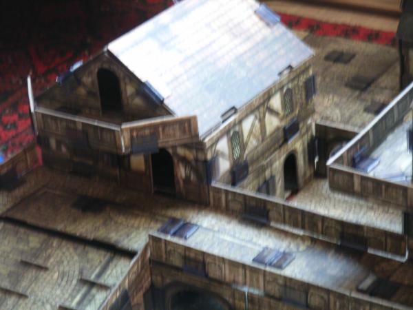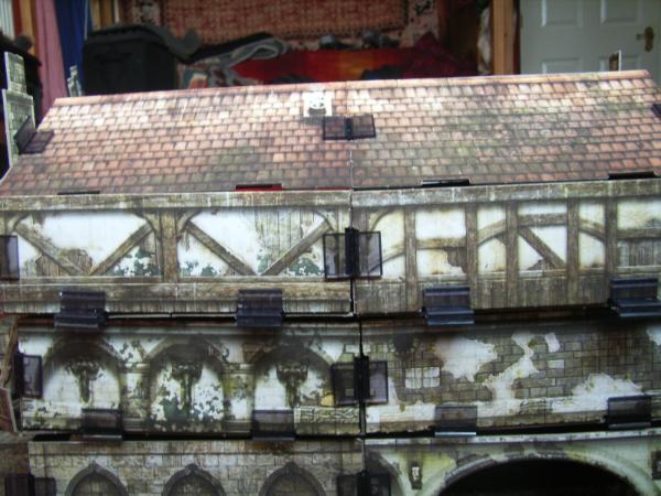But for now here are the pictures to date. Note that in the bottom right I have just laid some tiles as a floorplan for two small buildings with narrow alleys between and in the top right there is a gap where a more considerable house will go. Three of the four buildings are complete - the big central one with three storeys, the left centre smaller one that has two storyes and an attic level and a small house right at the back that has a ground floor and attic.