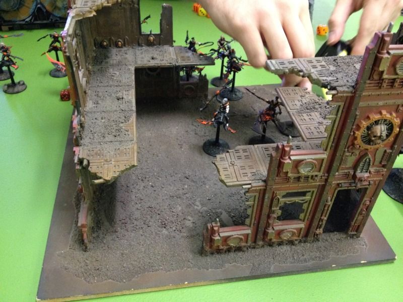 Two ravagers hide behind the upper left turret with the third hiding behind the upper right turret with the embarked Witches.