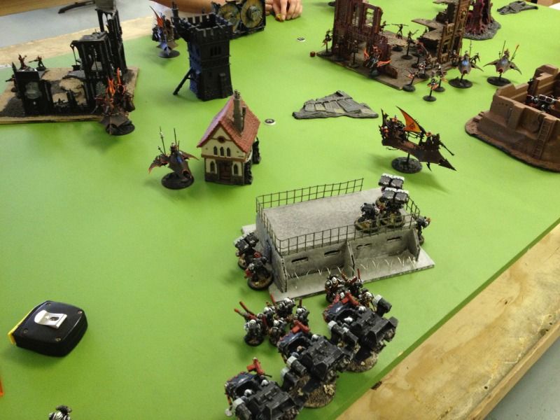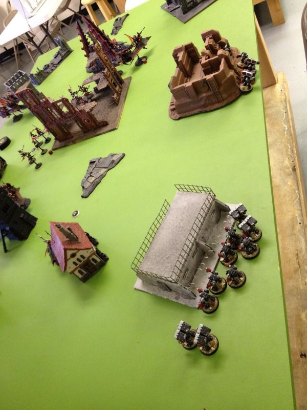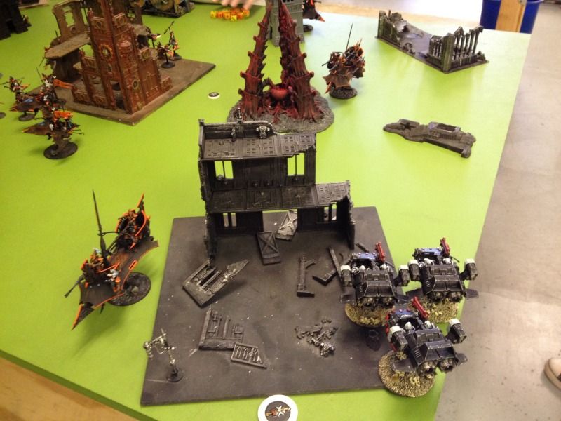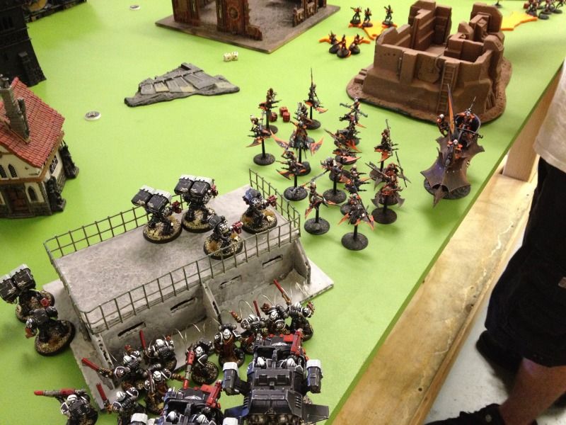 The 2 ravagers on the left flank position themselves to fire back on terminators on the left.