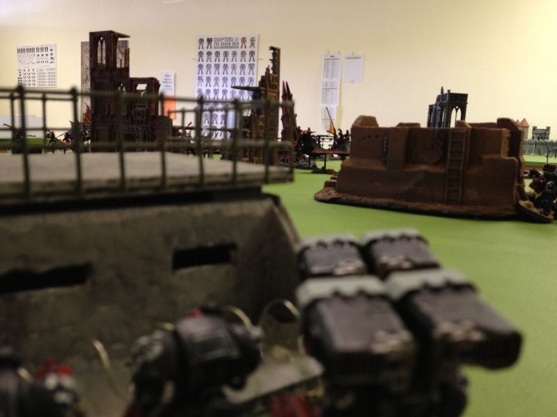 I fire the duo of terminators and a lascannon at the still mobile ravager in the upper left and Brian’s flicker field saves deny all damage.
