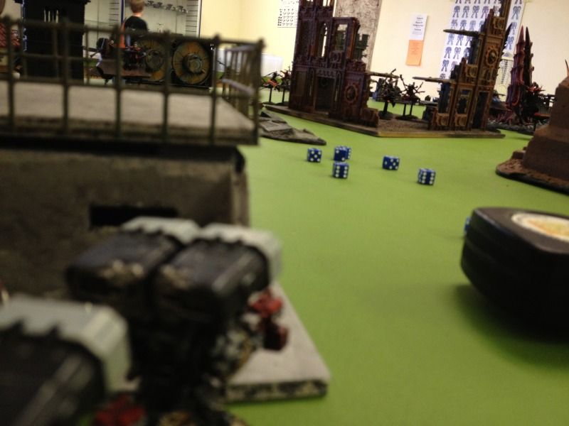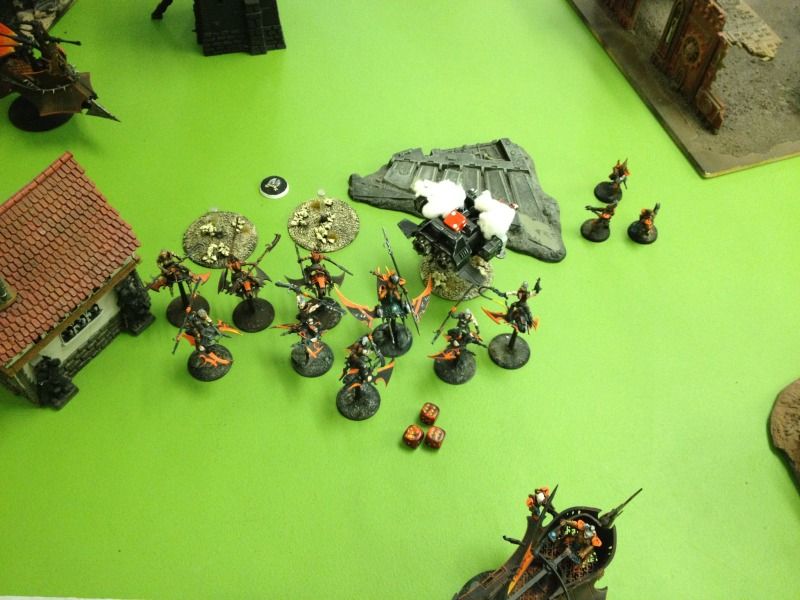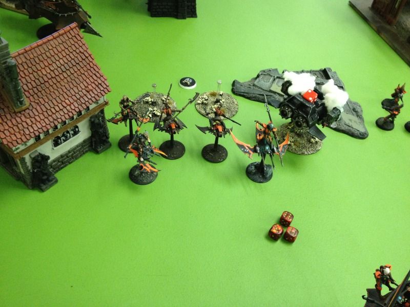 The further back ravager takes a bead on the squadron of speeders and manages to cause 3 pens but the venom wreck thankfully provides cover and one pen get’s through shaking one. The other