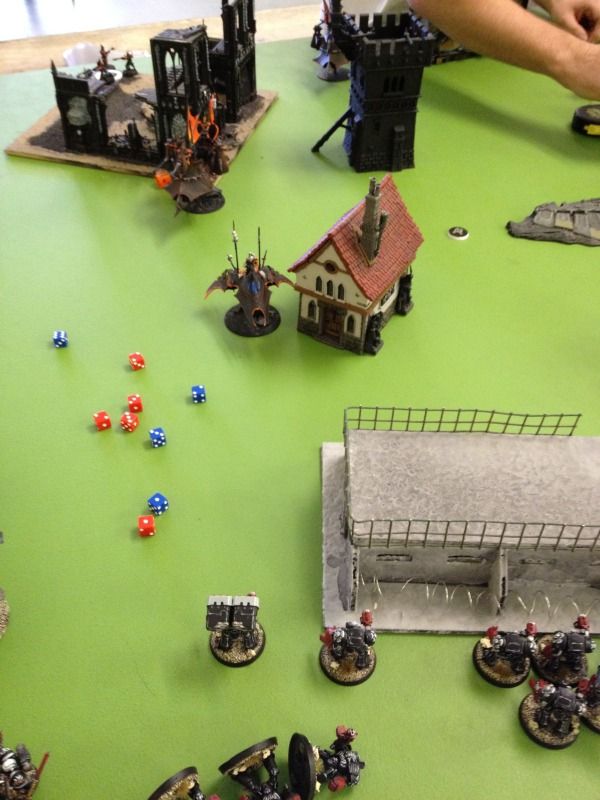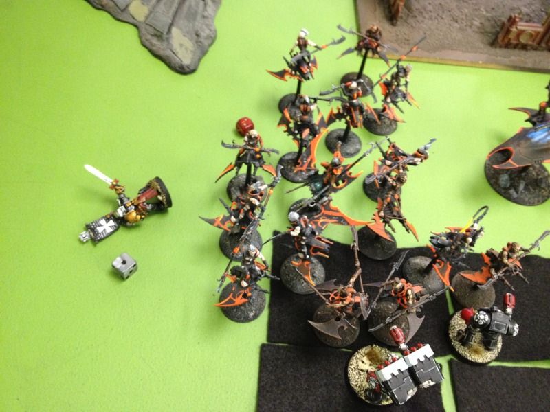 The fully buffed hellions come swinging in with a bajjillion attacks and deal quite a few wounds but my armours saves hold up and I only loose 4 marines and pass my fearless saves.