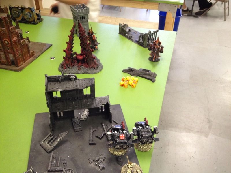 The trio of speeders in the right ruin open up on the ravager that flated out and managed to get 2 pens and a glance but with Brian’s superior dice rolling skills makes all three cover saves. Goodbye speeders.
