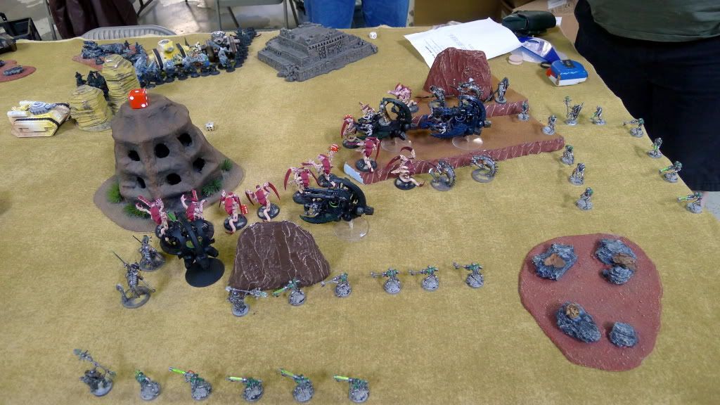 I kill a bunch of guardsmen. He kills my Overlord and the solo right wraith.