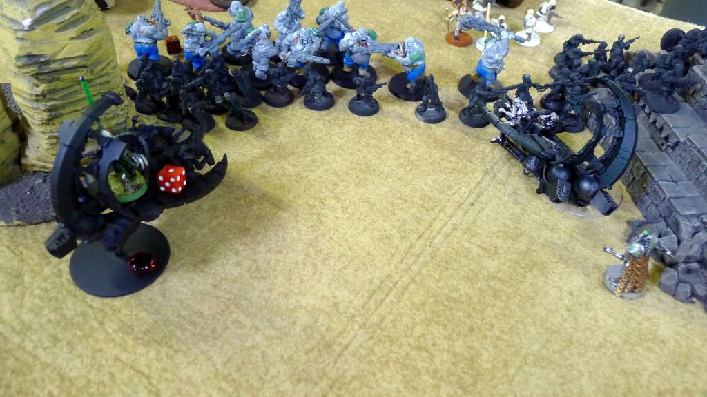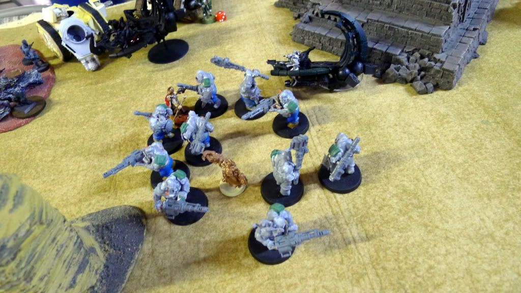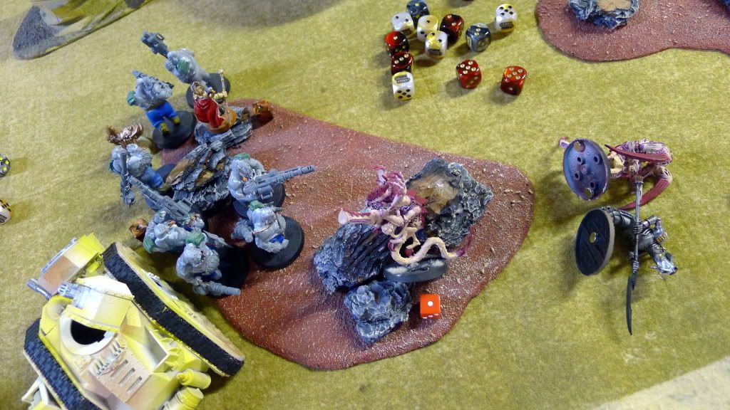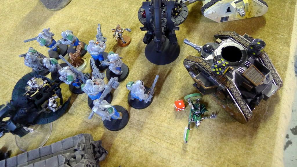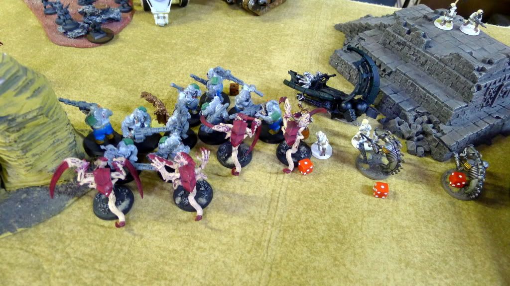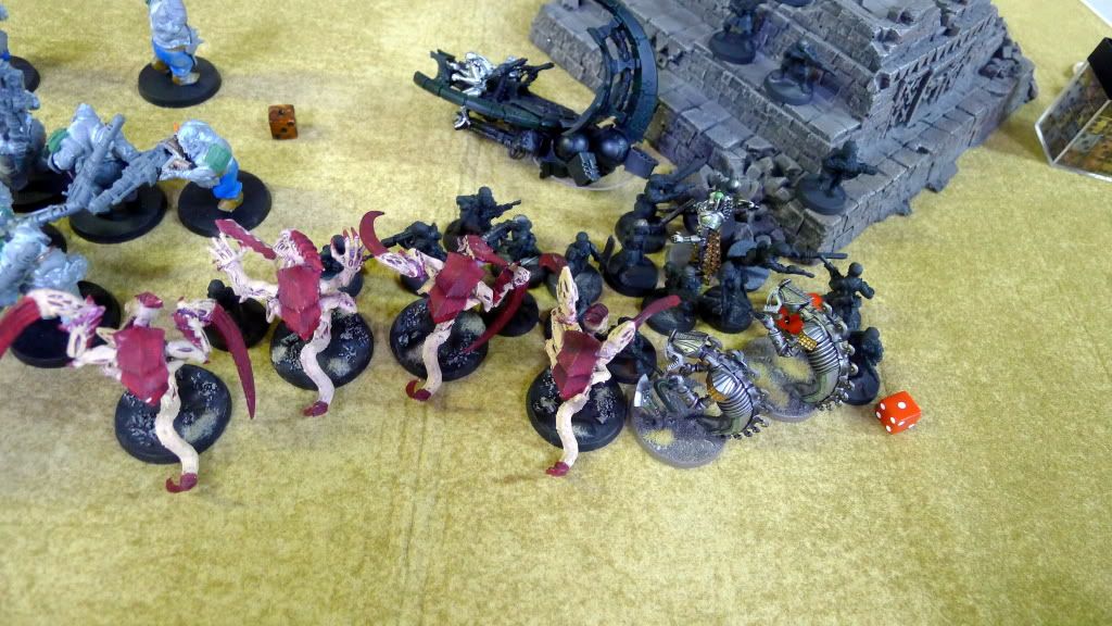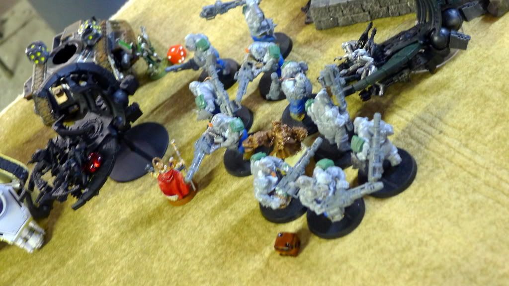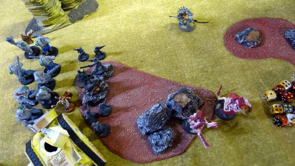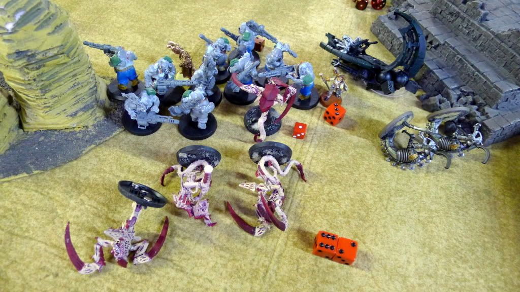 Blob squad kills 2 wraiths and puts 2W on my Overlord, though I do kill enough guardsmen to send his lone PCS fleeing.