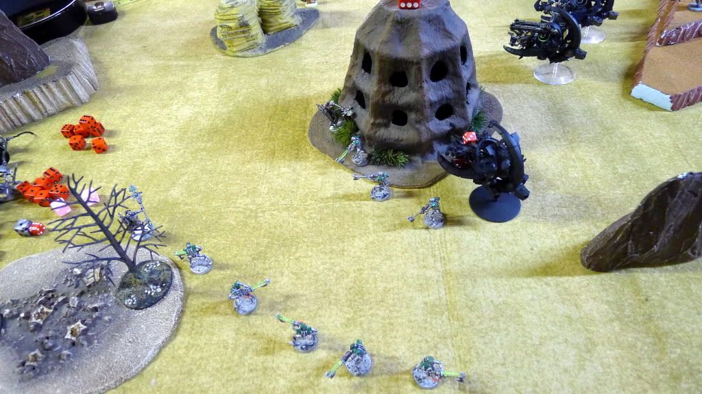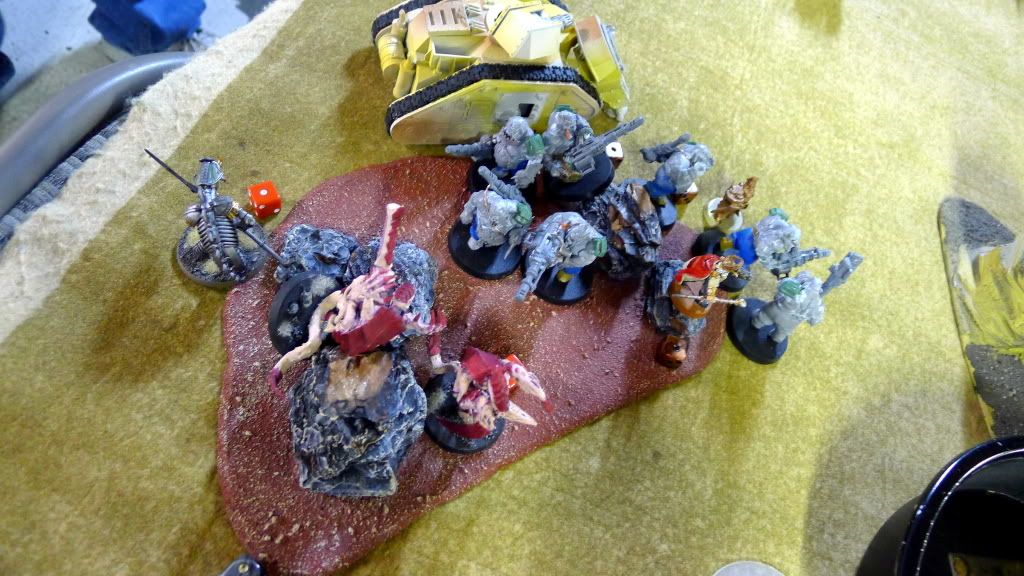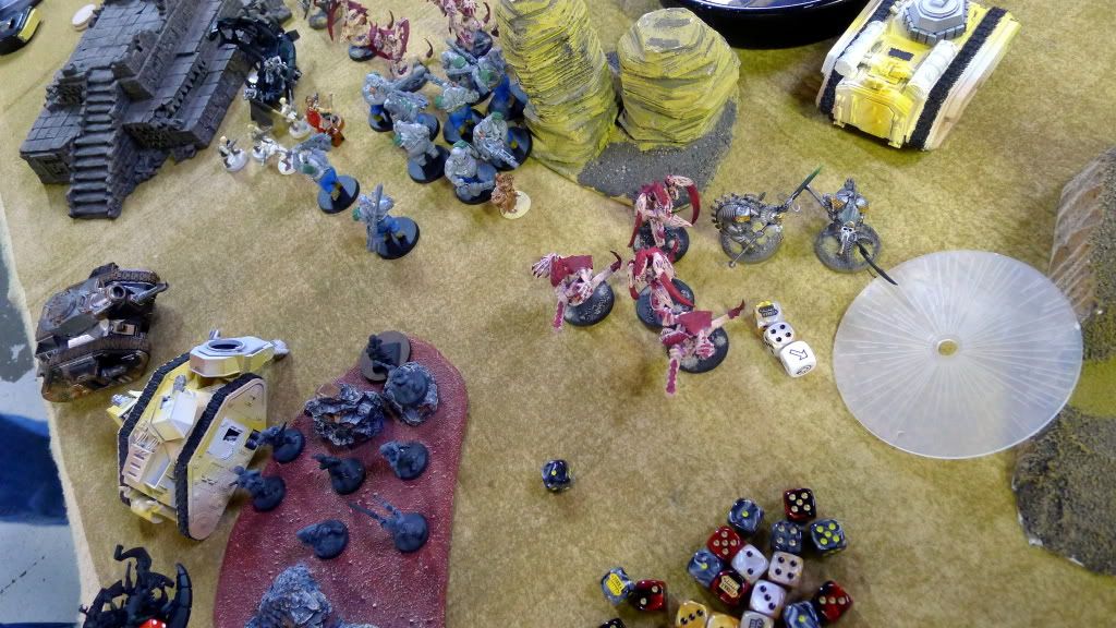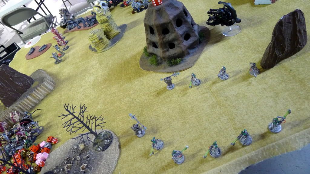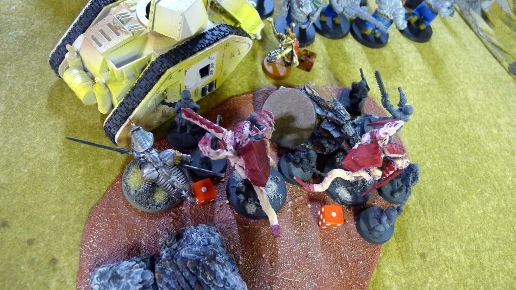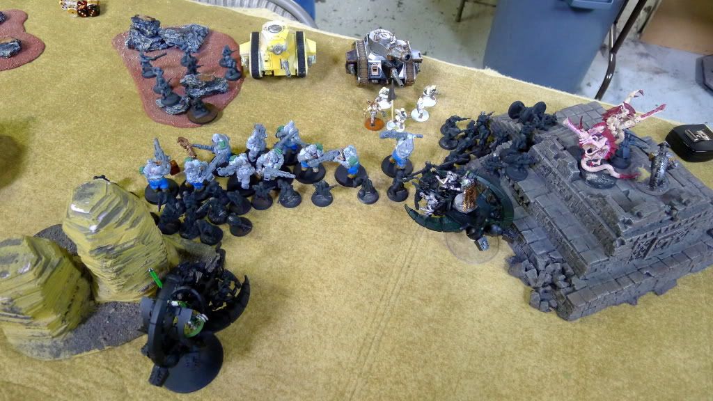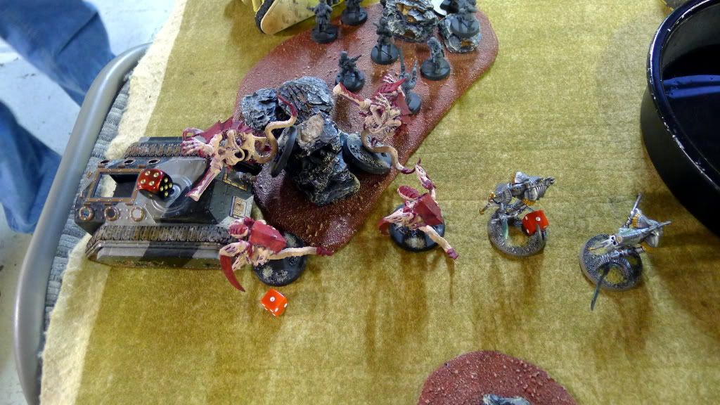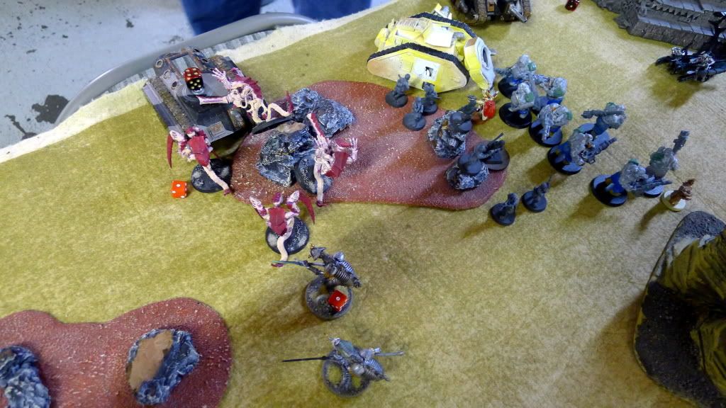 Blob squad kills 2 wraiths and puts 2W on my Overlord, though I do kill enough guardsmen to send his lone PCS fleeing.