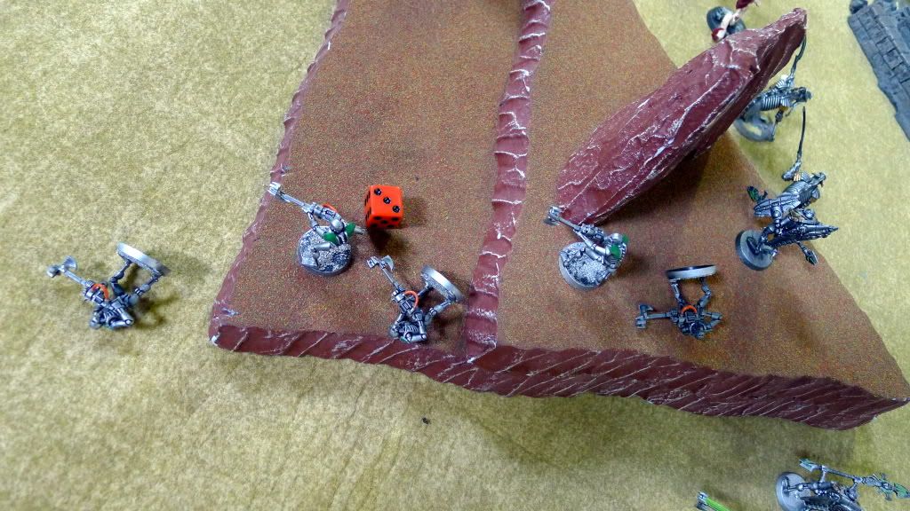 His demolisher then winds up for a shot at my nicely-clumped-up wraiths. Fortunately for me, it lands way off target.