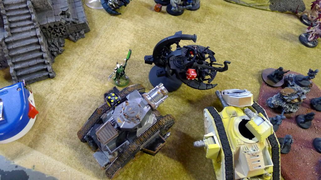 One of his demolishers wreck my right command barge with a lascannon. The other demolisher pens my left command barge (again, with a lascannon) and only immobilizes it (upgraded from a weapon destroyed), which I transfer via Symbiotic Repair into 1W on my Overlord.