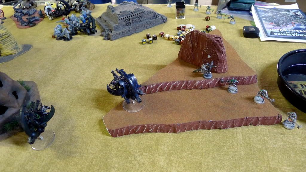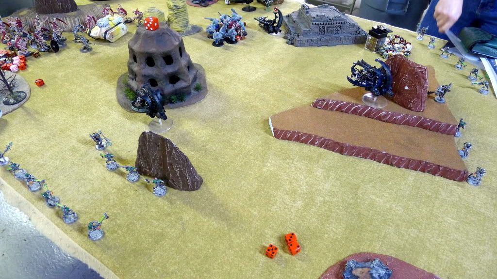 2. Only the colossus (and hellhound) can really hurt my troops. I'm not at all concerned. With proper spacing, colossus will only be able to take out 3 warriors at a time (assuming it hits dead-on), of which on average 1 would get back up (so only 2 dead per turn of shooting). Hellhound would be dealt with before it can get close enough to become an actual threat to my troops. Hence, why I did not need to reserve my troops. I'd rather have my opponent waste his fire on them than on my wraiths.