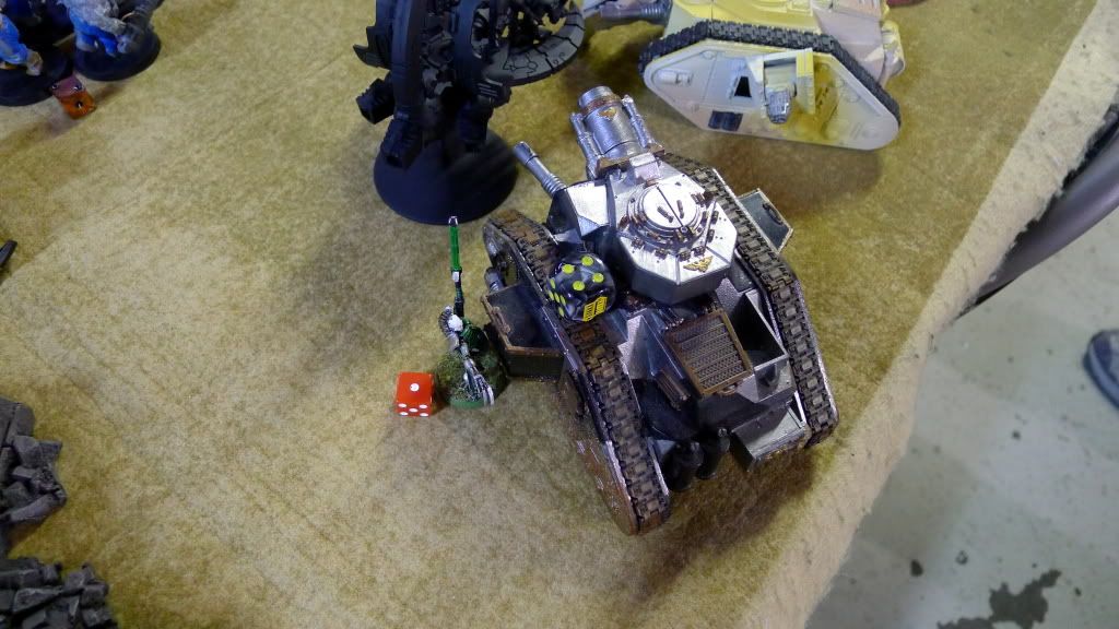So instead, I turn my left wraiths onto his hellhound. They fail to do anything to it with 20 S6 attacks. I guess that's not quite as bad as his ogryns failing to do anything to my command barge with 40 S6 attacks last turn (though against rear AV11).