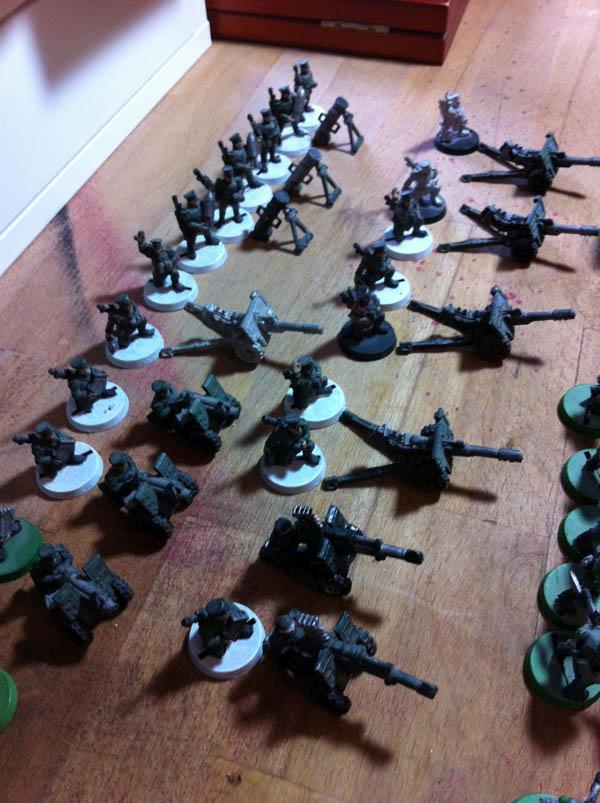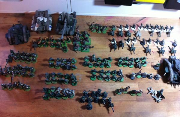 (60 metal OOP cadians, 25 Valhallans, 15 Mordians, 13x Mordian HWTs, 6 commissars, 12 catachan, Demolisher, Leman Russ, Hellhound, Basilisk - all old/2nd ed style).