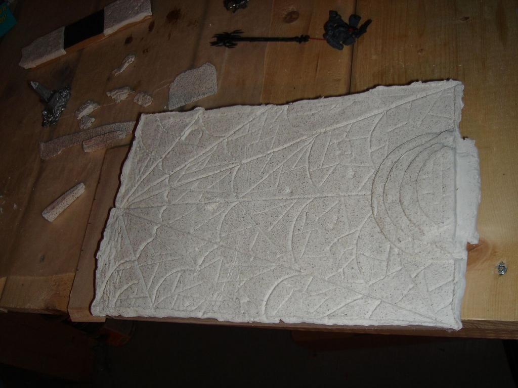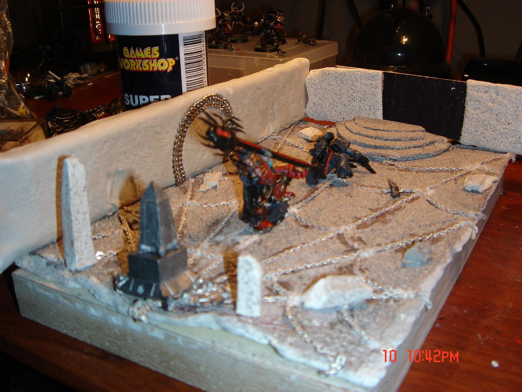 One wall on the far side with a portal on it. It currently has a ring to show the outline of the portal and with it i have etched the 8 point chaos star. Beside the portal i have 2 scones that are linked with a chain- at the center of the chain is another 8 point star on which i have glued a head to represent the chaos god manifest. I will take another pic for you of the altar.