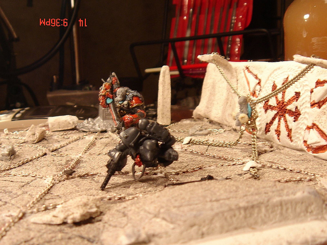 I had an idea one day to take a 40k Chaos lord (40kCSMLord2002) and remodel him I didn’t like him holding a Space Marine helmet.
