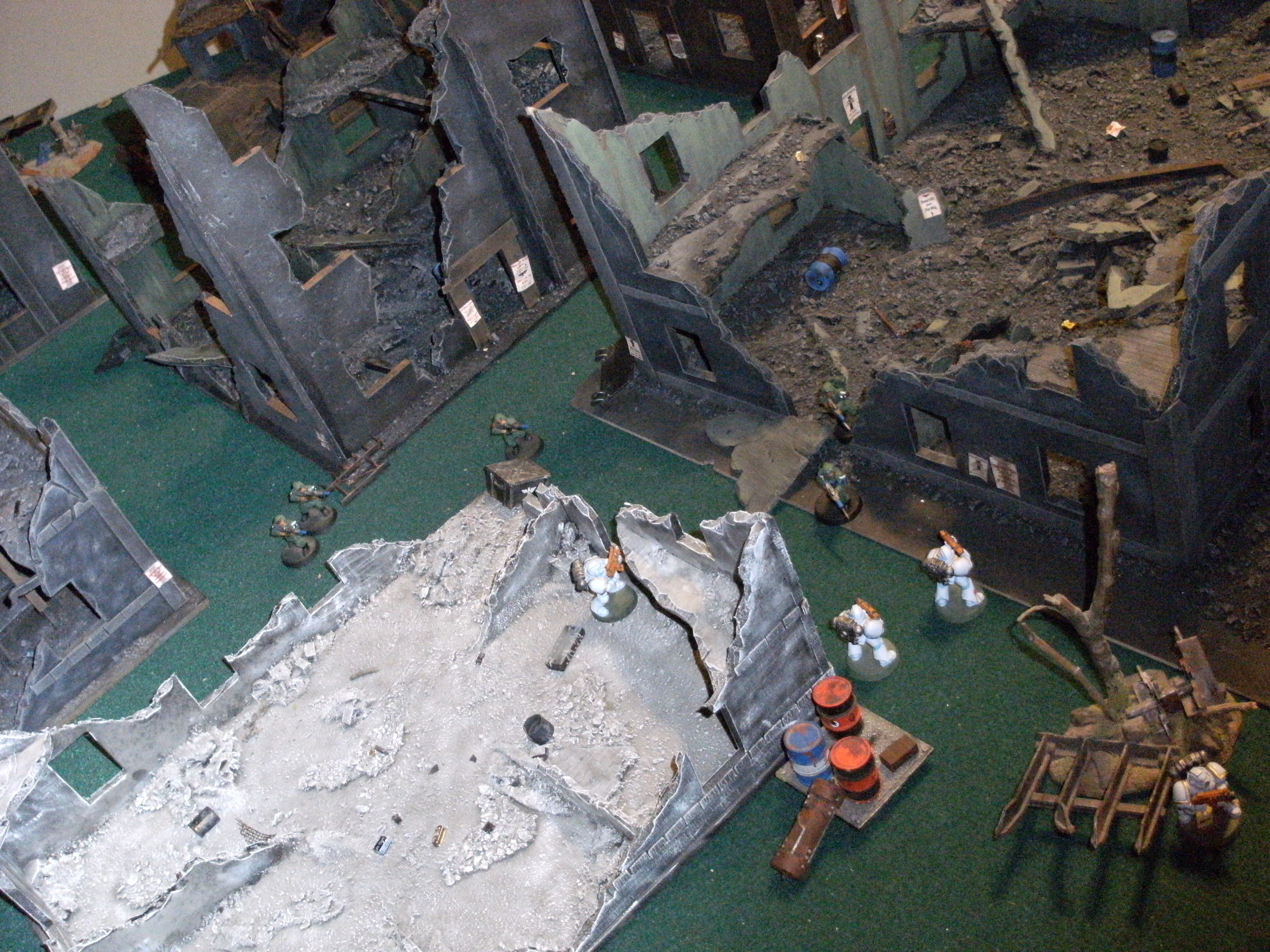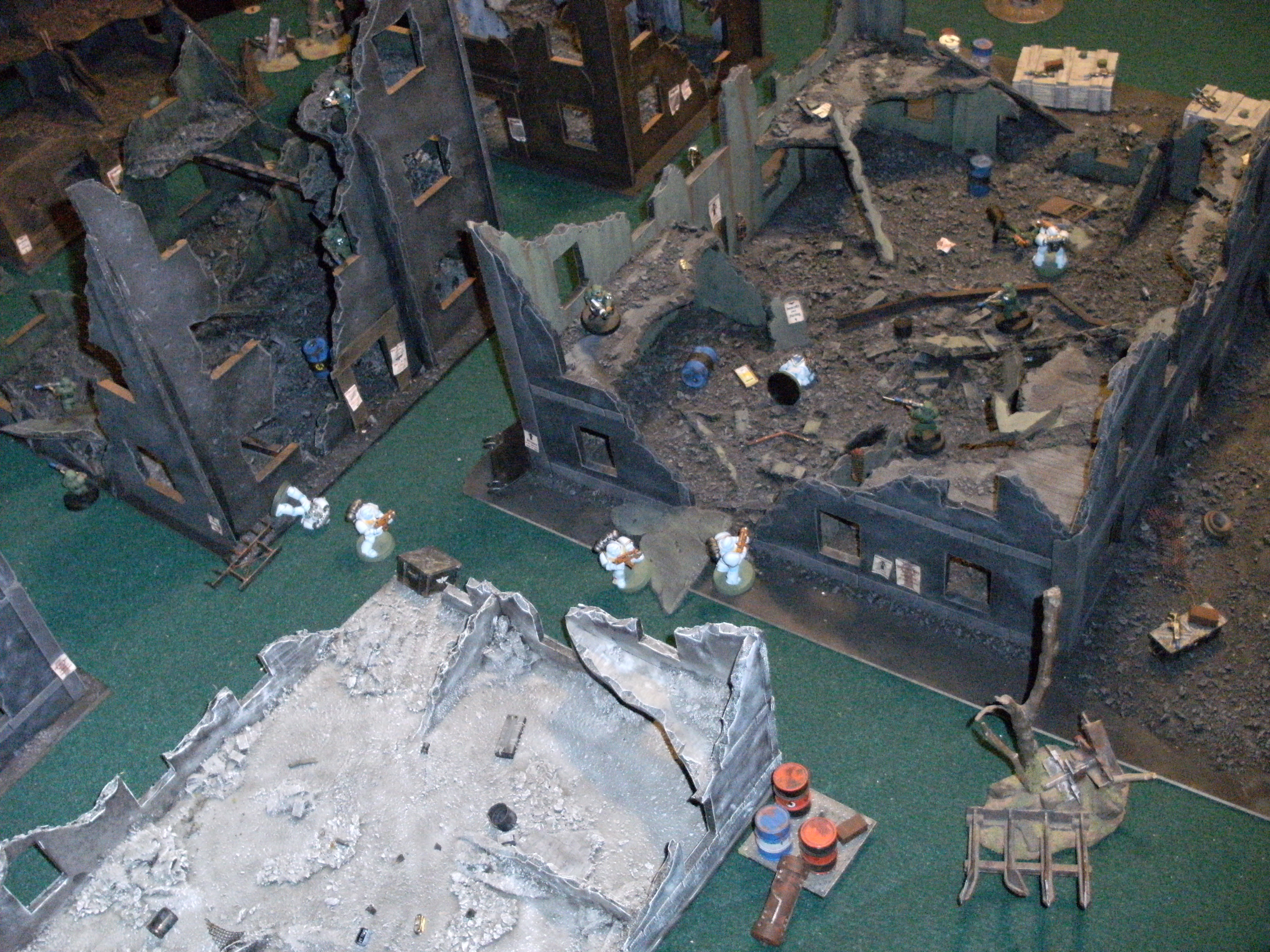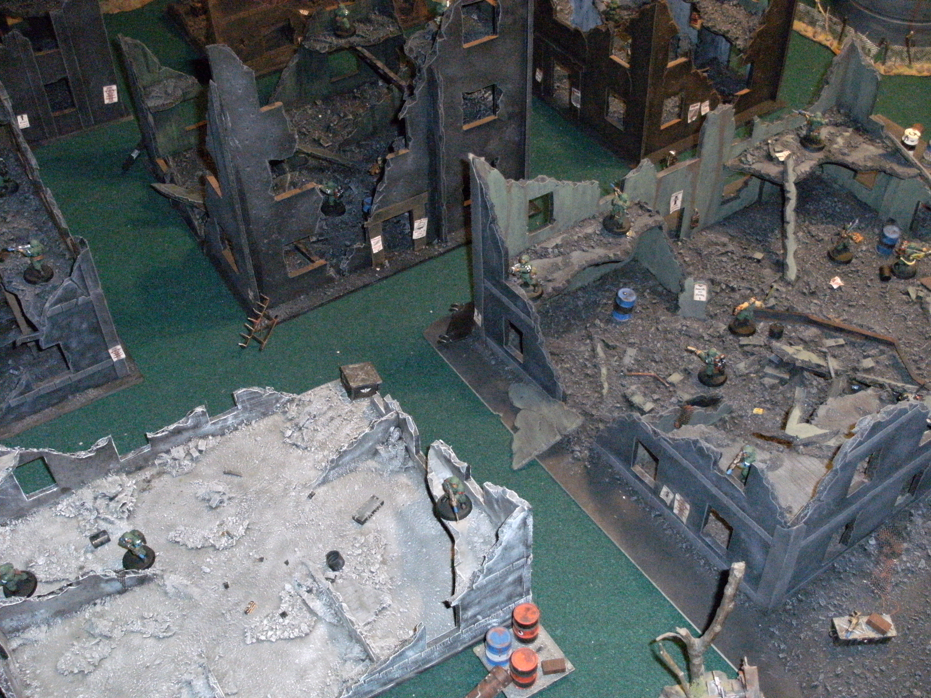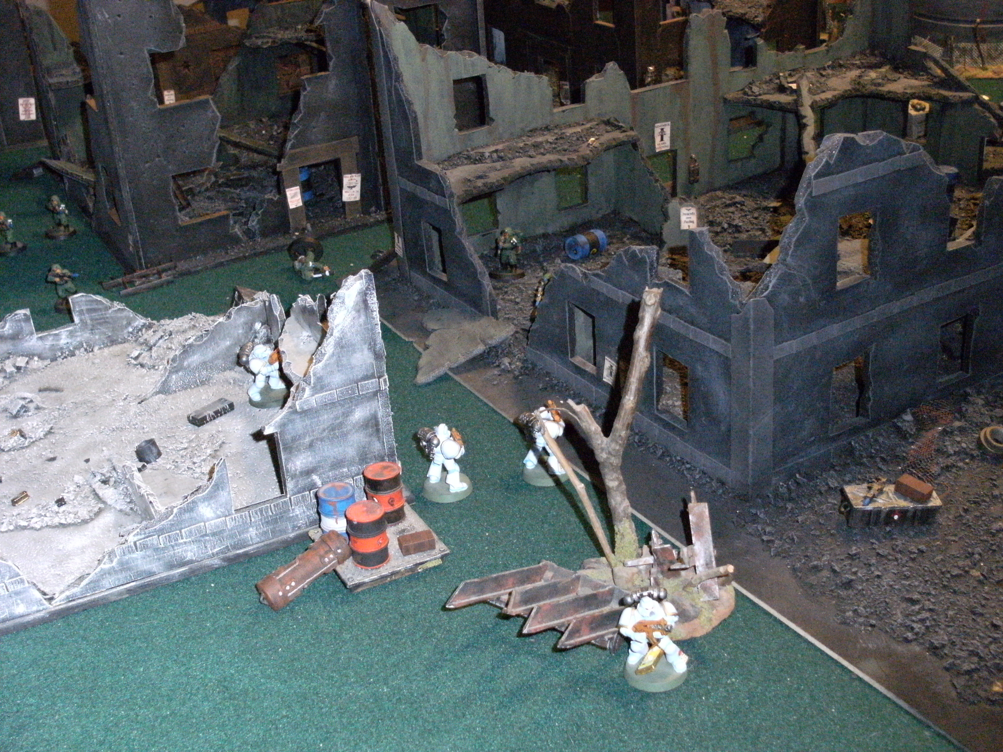 We started with the forces noted. City was setup and 3 barrels were used to show the possible location of the Artifact and were positioned by the IG player within 12" of the center of the board. The Space Marines were to find the objective and get it off the table. The Artifact could be picked up instead of shooting.