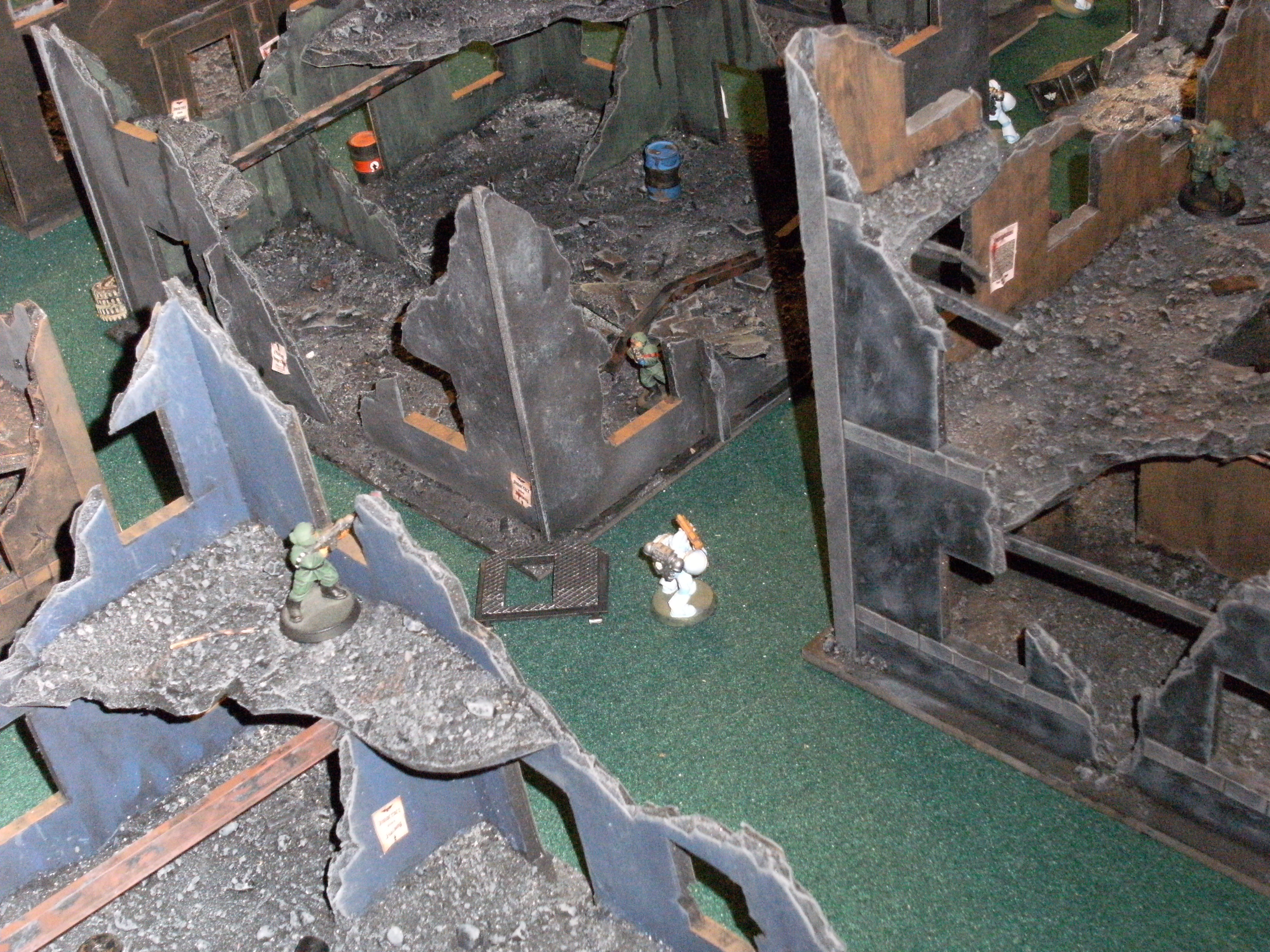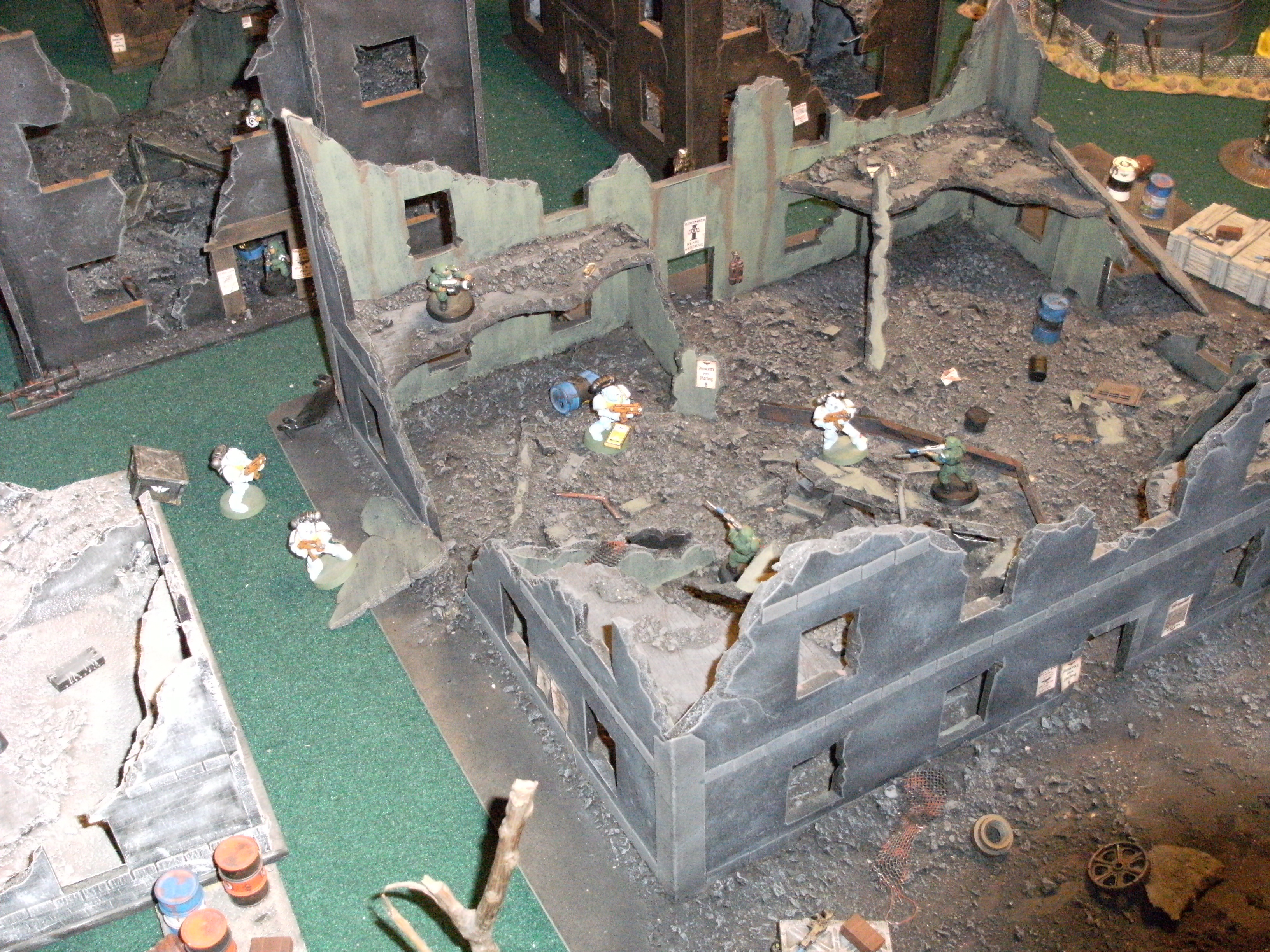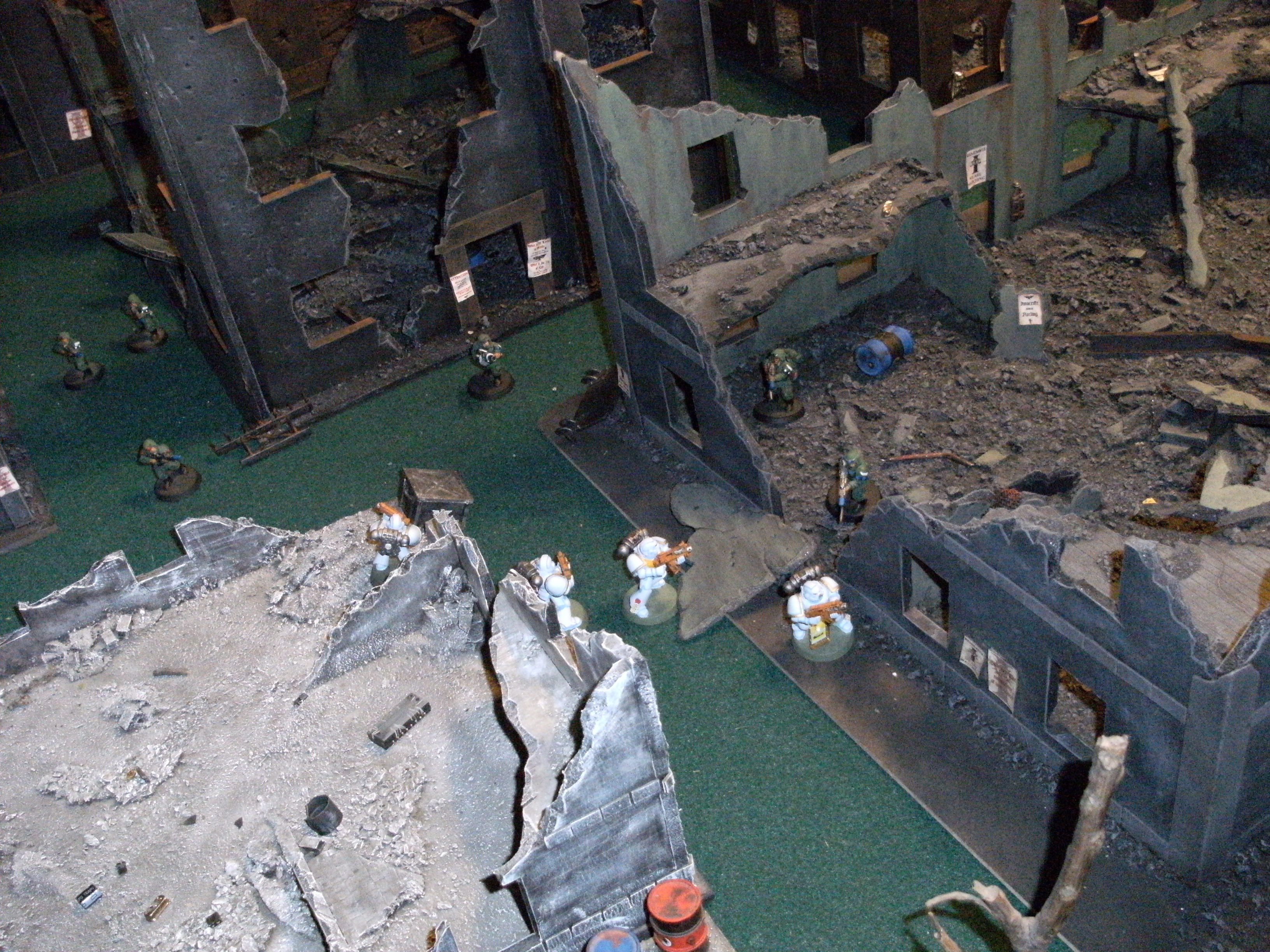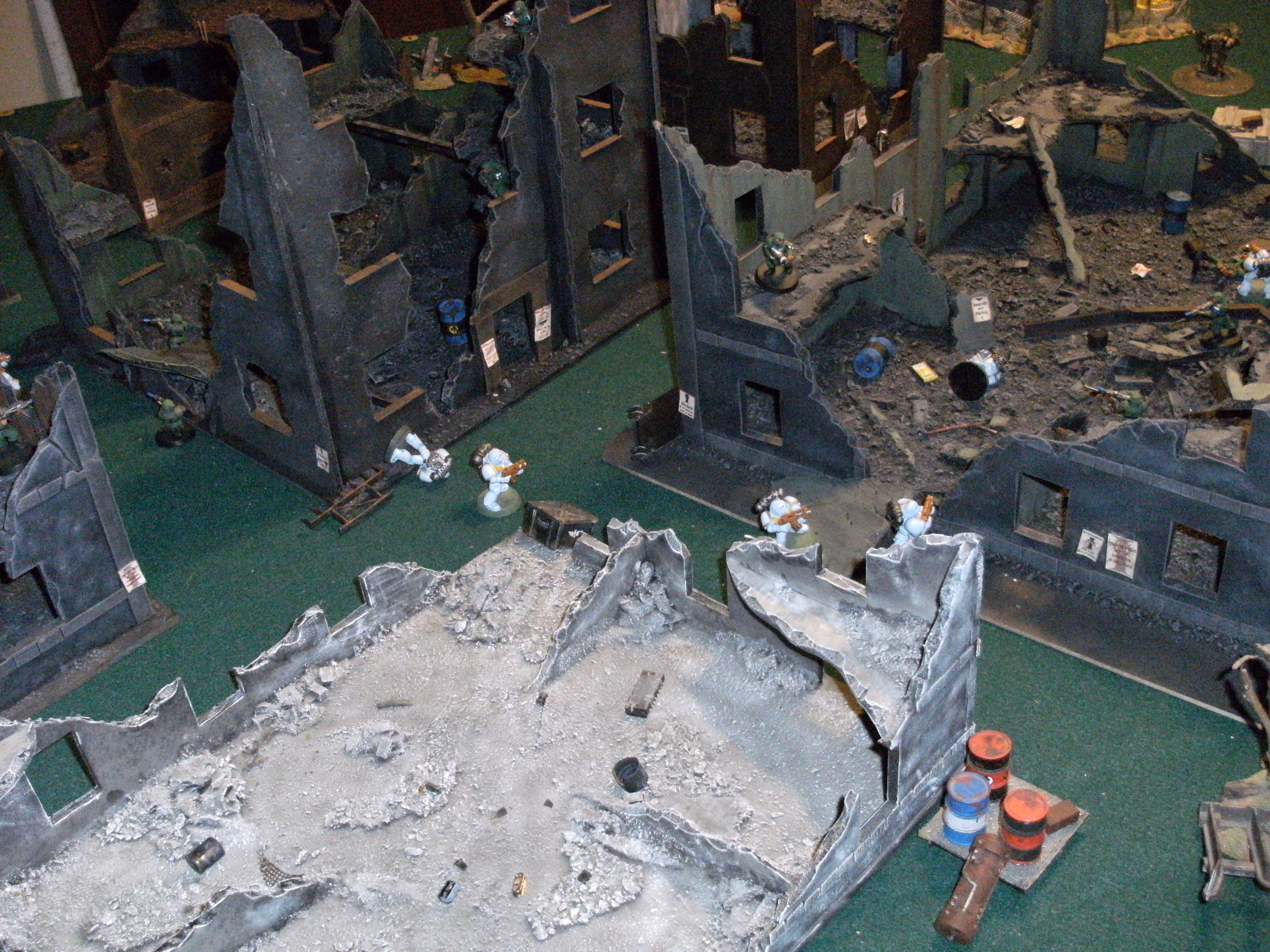 We started with the forces noted. City was setup and 3 barrels were used to show the possible location of the Artifact and were positioned by the IG player within 12" of the center of the board. The Space Marines were to find the objective and get it off the table. The Artifact could be picked up instead of shooting.