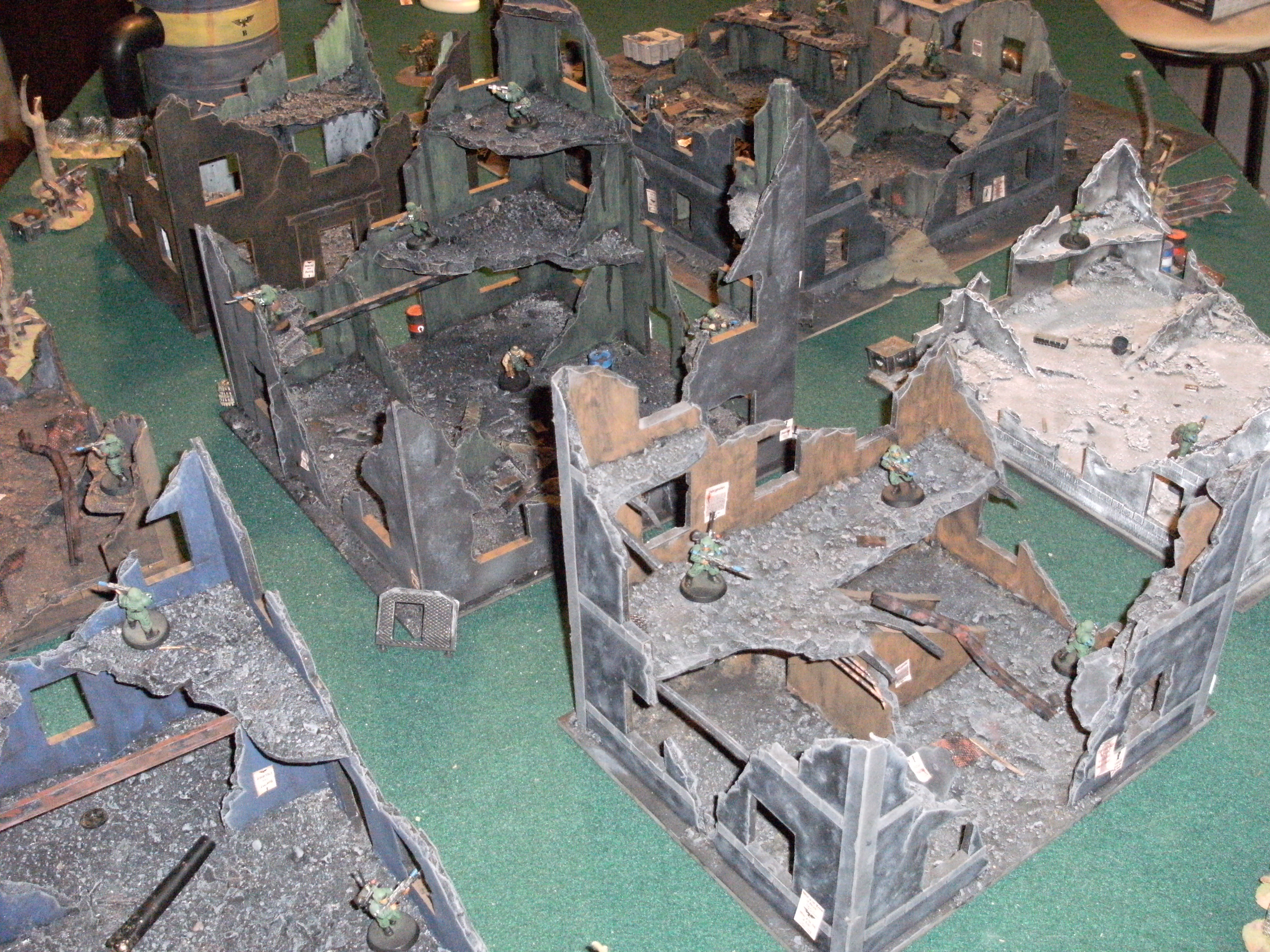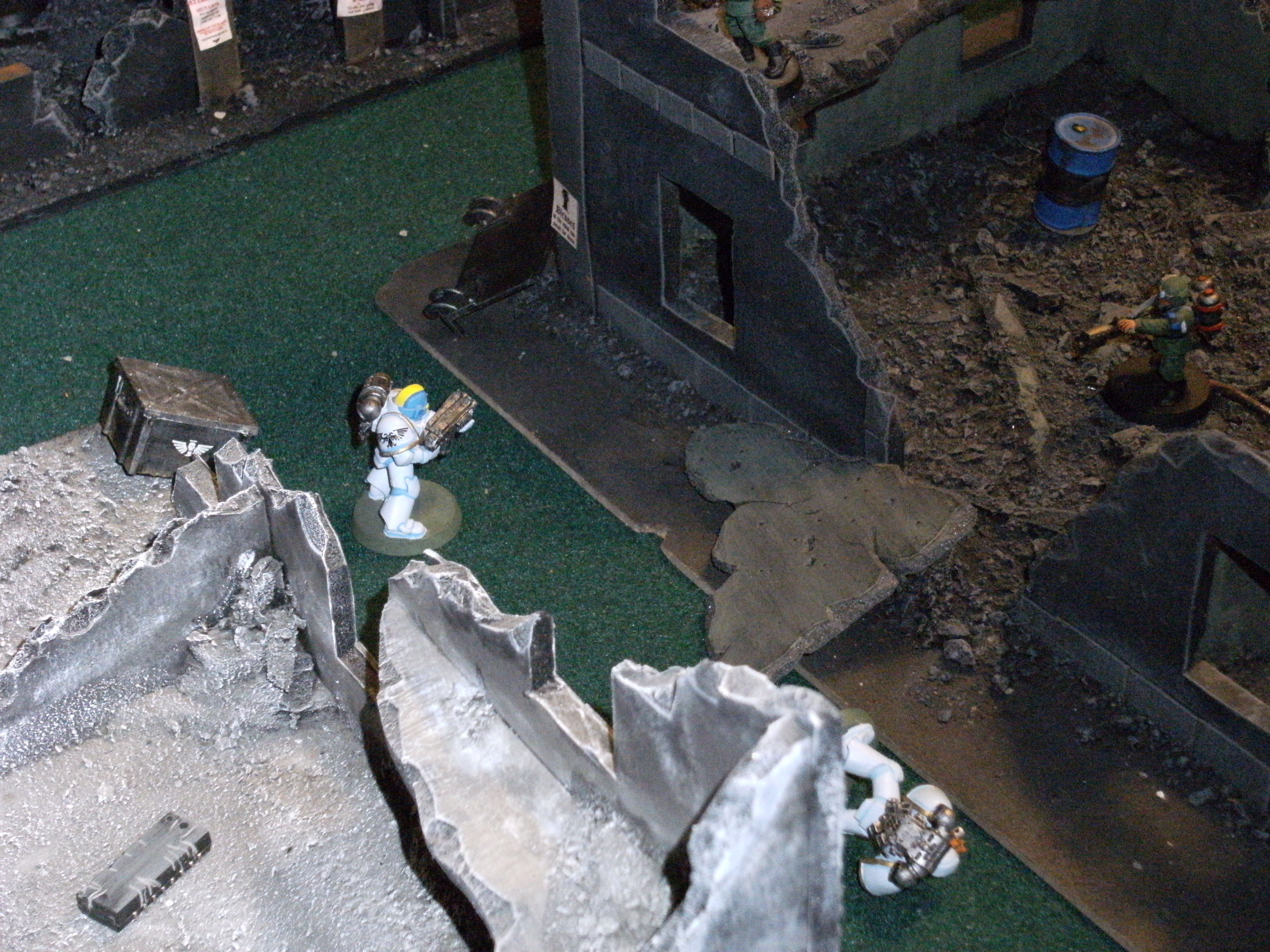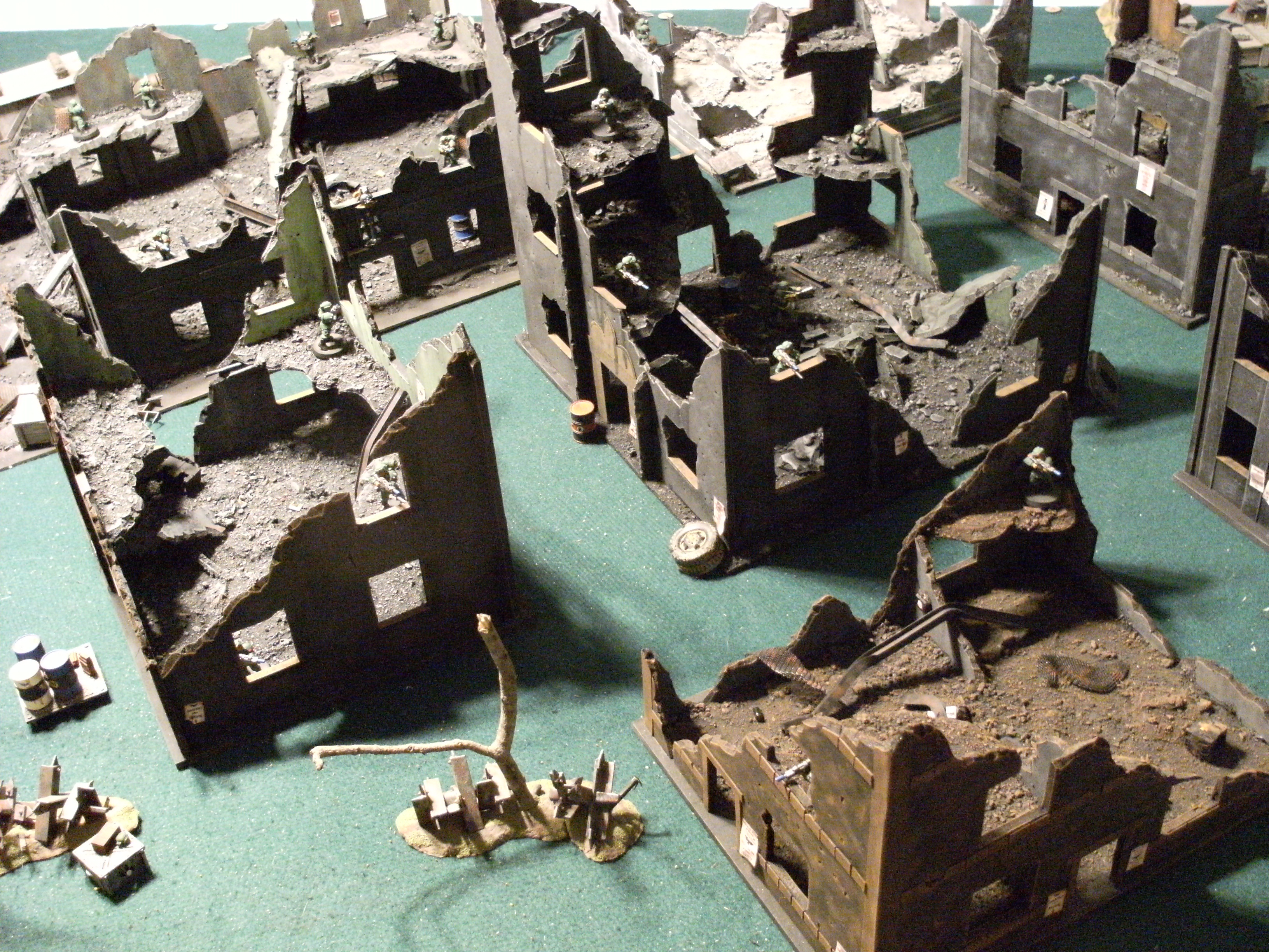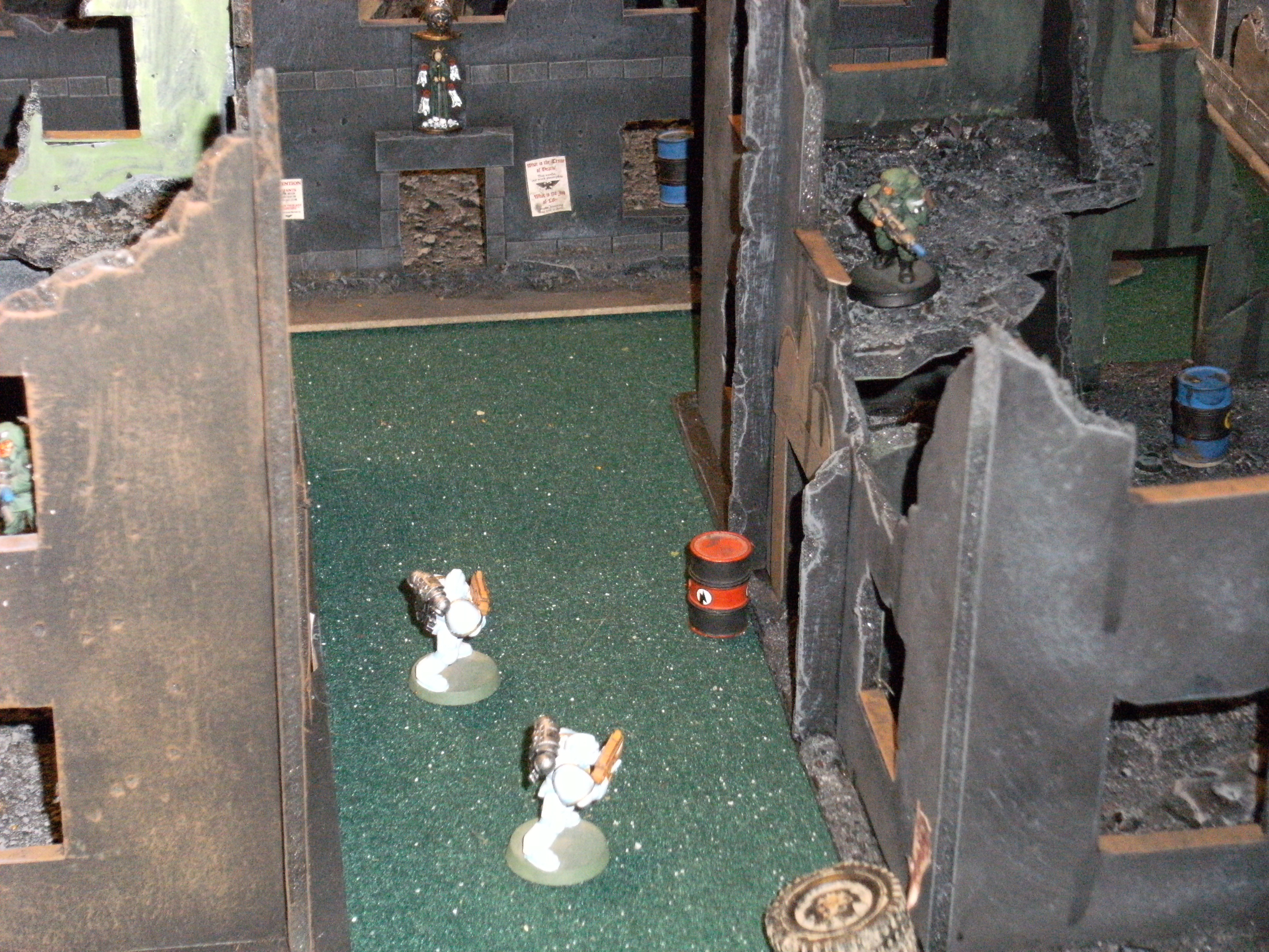 We started with the forces noted. City was setup and 3 barrels were used to show the possible location of the Artifact and were positioned by the IG player within 12" of the center of the board. The Space Marines were to find the objective and get it off the table. The Artifact could be picked up instead of shooting.