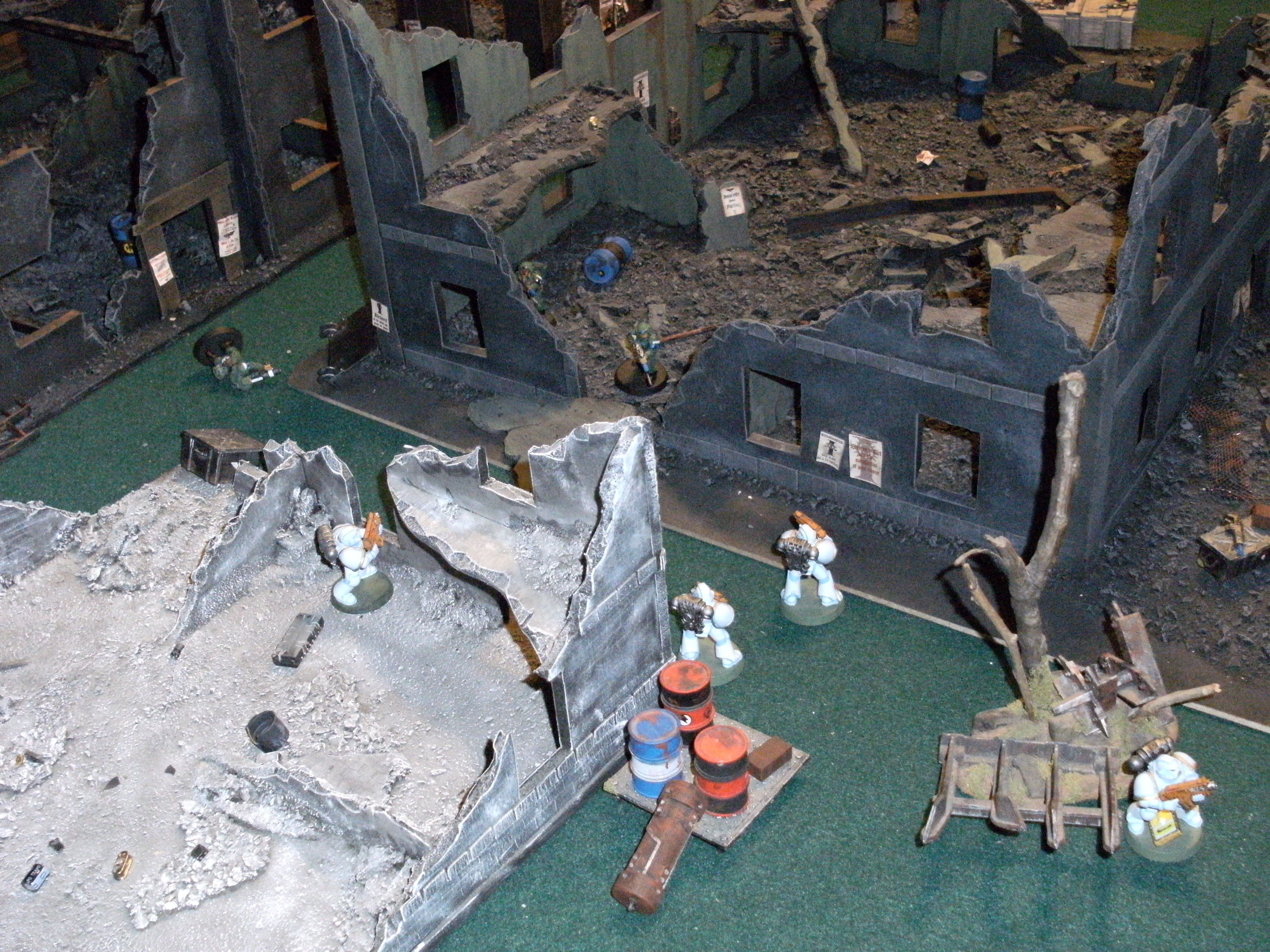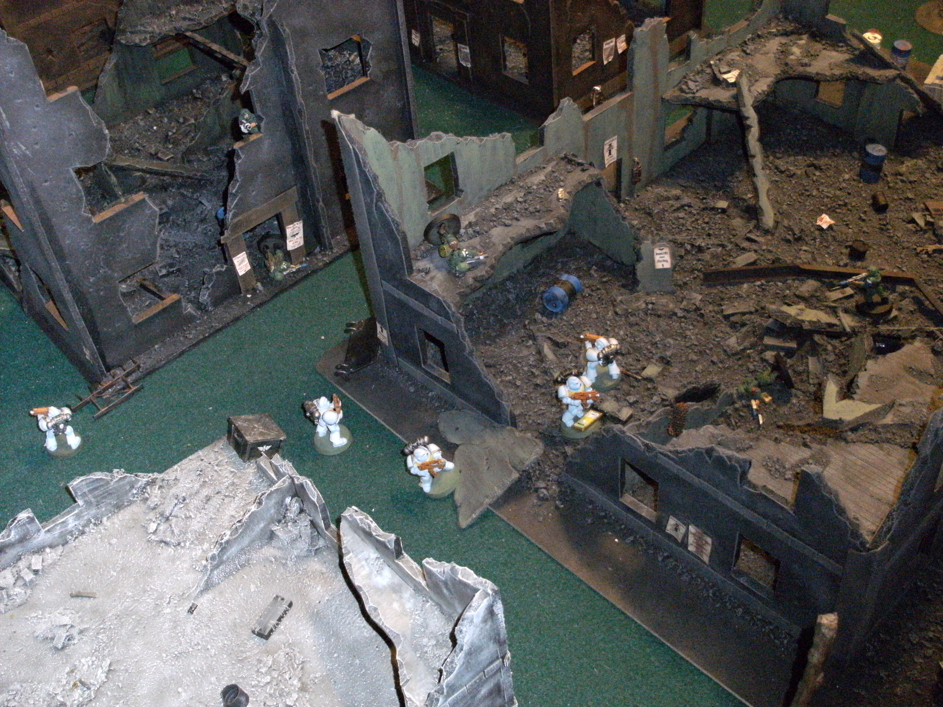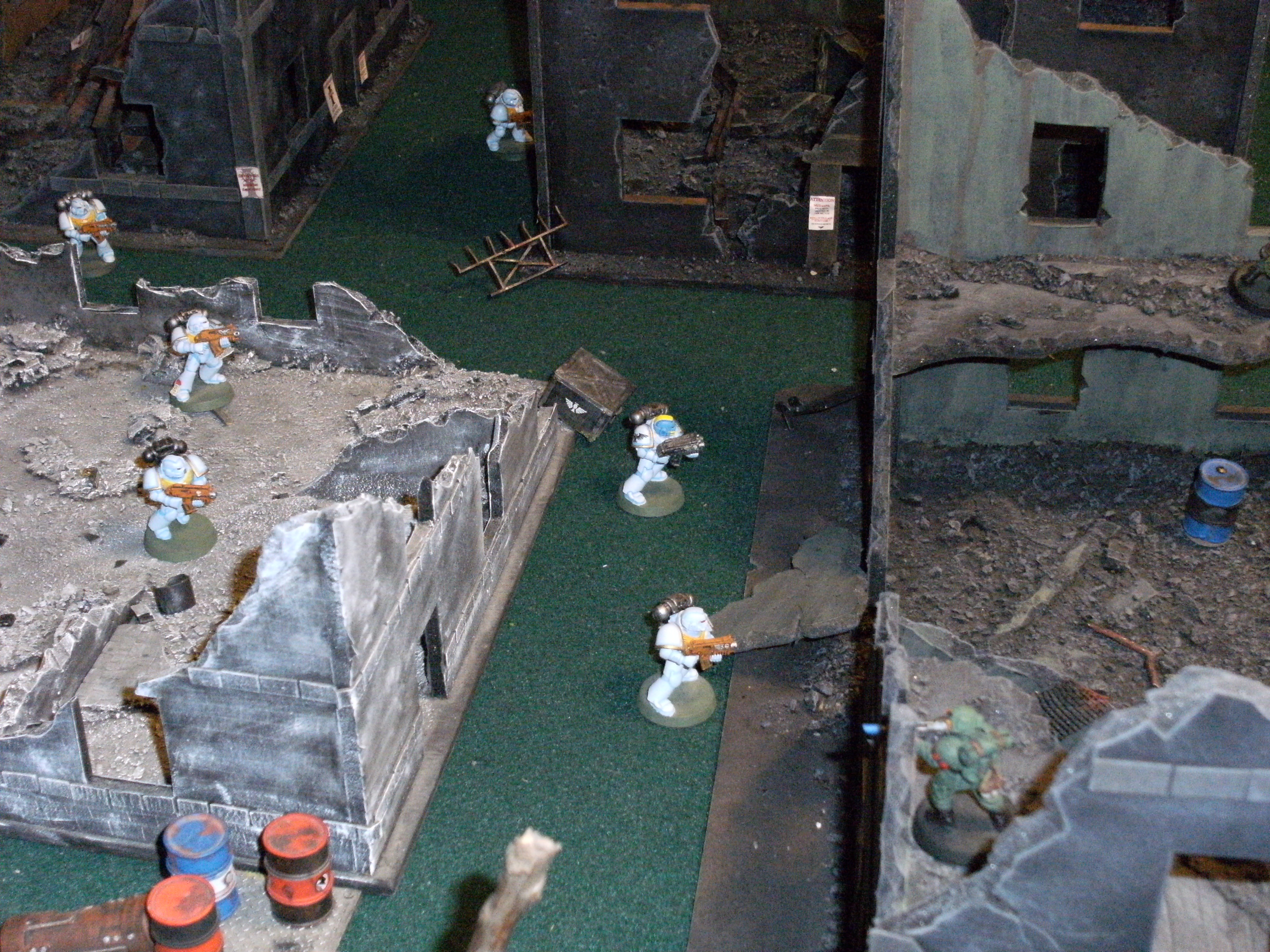 All terrain permits 4+ saves. maximum turns = 12!!! I.G. setup first after the 6 random starting points have been determined and placed around the perimeter of the table. Space Marines are divided into (7) 2 man units & get first move entering with d3 two man units. The rest of the Space Marines are in reserve.