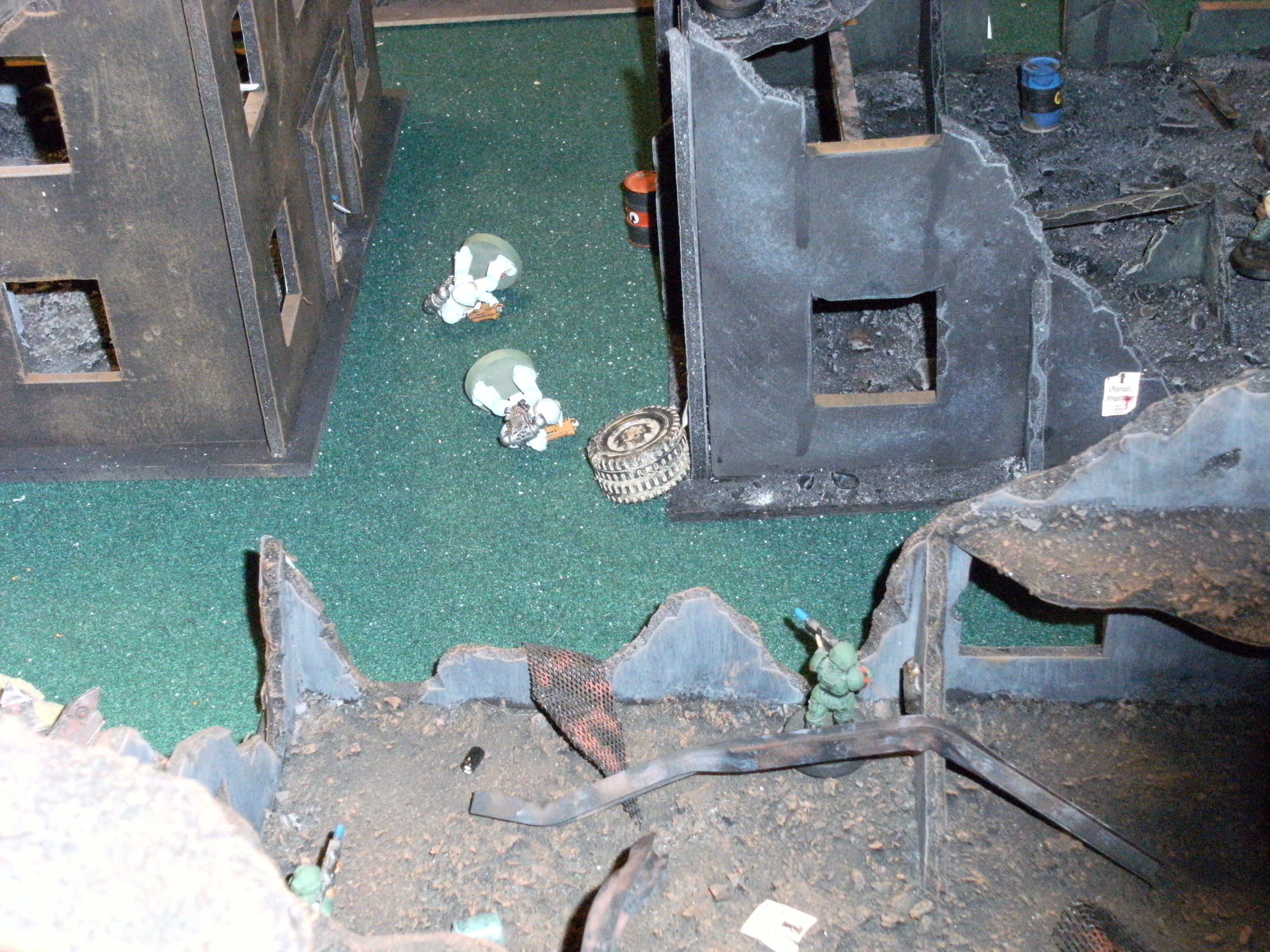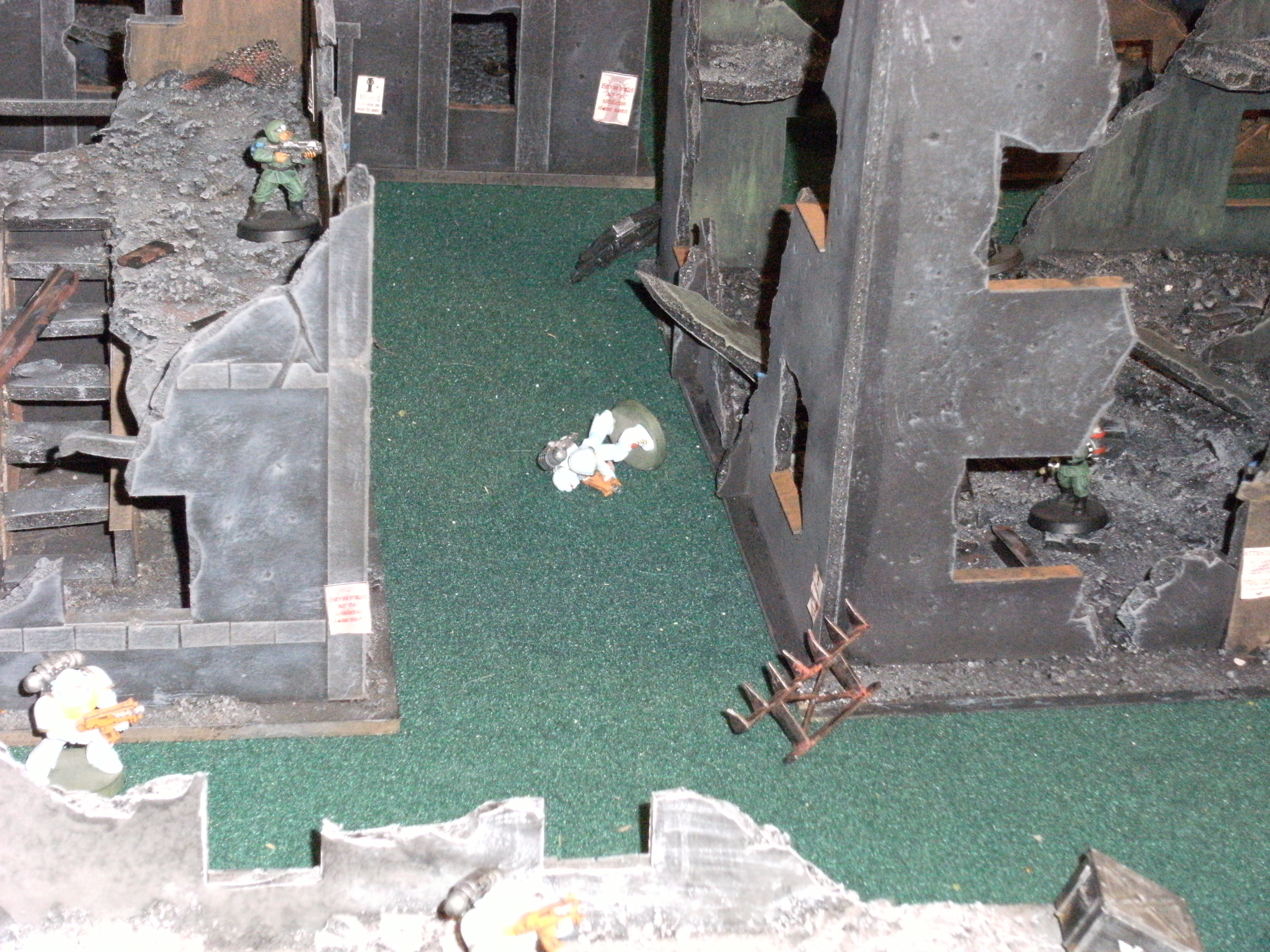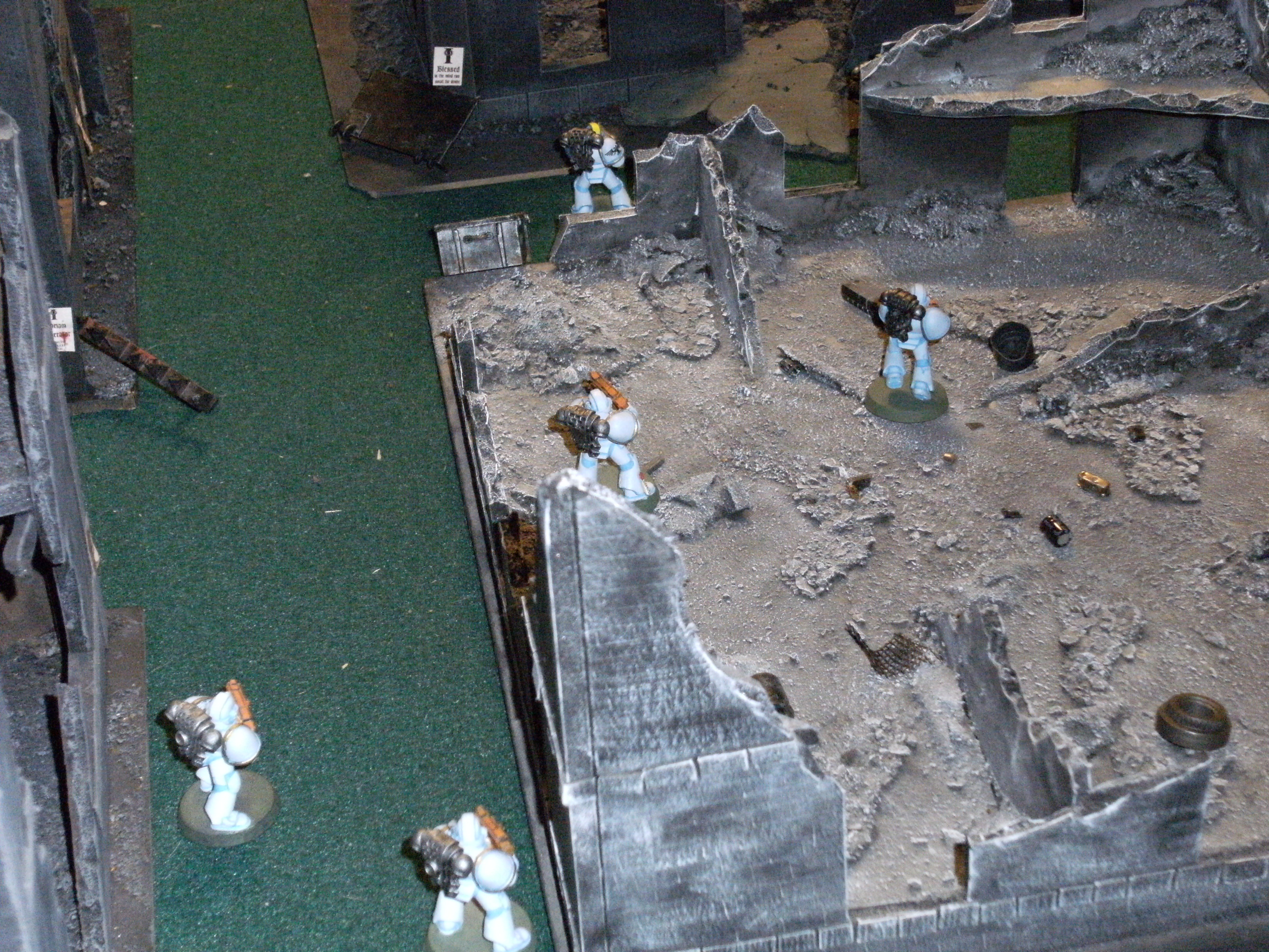 All terrain permits 4+ saves. maximum turns = 12!!! I.G. setup first after the 6 random starting points have been determined and placed around the perimeter of the table. Space Marines are divided into (7) 2 man units & get first move entering with d3 two man units. The rest of the Space Marines are in reserve.