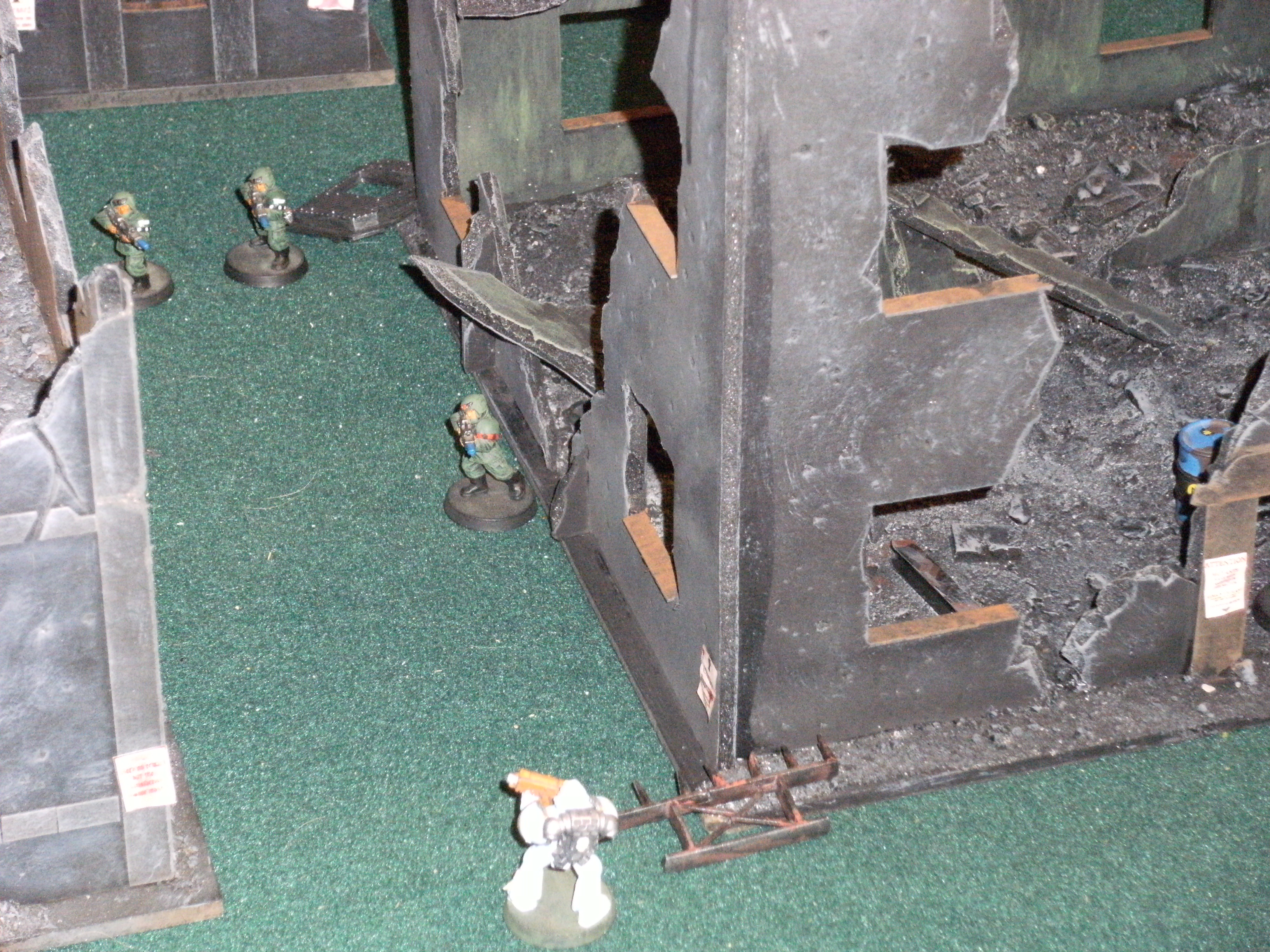 After the table was setup and the barrels positioned the IG deployed anywhere on the table at least 8" away from any of the six random starting points for the Marines. The (14) Marines were divided into 7 two man groups. The Marines started with d3 units with the rest coming on in reserve. Starting points were rolled for with no restriction on how many groups could start at a given location. The Marines move first and turns are taken as normal. Shooting was done using normal shooting rules, but each model had to be committed to a target and all shots at a given target were taken at once. Each Marine turn the Marines would move each model and then roll for reserves with each arriving group starting at a random location around the board. The battle runs for 12 moves or until the Artifact is moved off the board or all enemy models are killed!!!