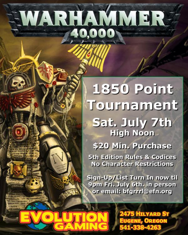 Subject: 40k Tournament, sat. July 7th, Eugene Oregon