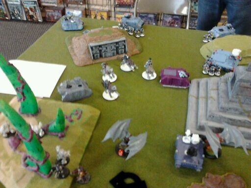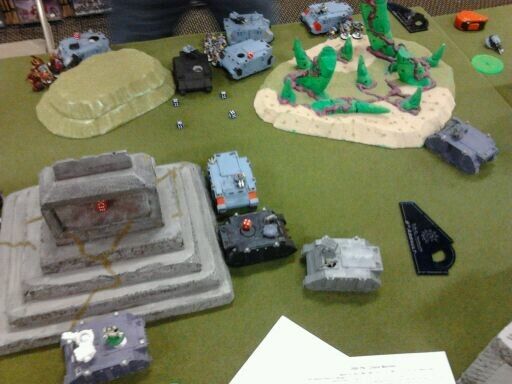 He shoots everything at me and wipes out my berzerk squad in the top right corner that took out his long fangs, the cover didnt hold up. The squad in the middle takes some casualties but is able to stay alive. He shoots into my plague marine rhino and wrecks it. I disembark in the area terrain away from the dogs. His hounds assault my last 3 oblits and wipe the floor with them. I do no damage in return and they consolidate 5" back towards his side.