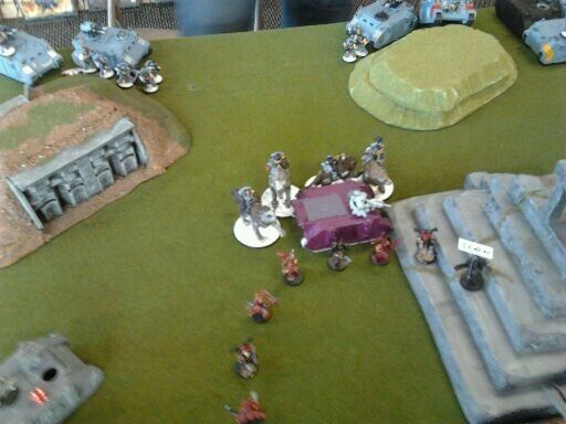 The wolves charge in and the powerfist manages to get 2 6's and then wrecks the rhino. The berzerkers pile out next to my prince.