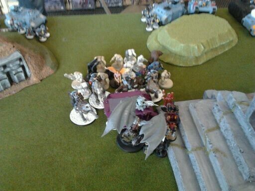 Mid-game analysis: That turn hurt but it could of hurt a lot more. I have 6 oblits and 1 plague marine squad on the left flank with 2 daemon princes as support. That is 12 twin linked plasma gun shots and 4 non twin linked 16 plasma shots at 4 guys I think I can hurt them enough and come in behind with one or two daemon princes to mop it up.