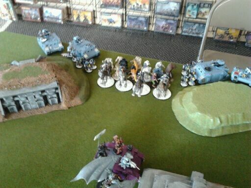 Pre-game analysis: Wasnt really wanting dawn of war with my assault army now having to go 36+" to reach his side of the board and combat. Getting the first turn at least allows me to dictate the inital battlefield. I plan on deploying the combi-melta rhino up on the front with a lash prince ducking behind it. Hope he doesn't steal on me. Gonna try and lash daisy chain his wolves towards me leaving the big lords in his deployment zone to avoid fighting them. Hopefully I can get them to run off the board after beating him in combat. If i can kill them off that is over 1000 points in a victory point game. should be interesting to say the least. I choose to have no reserves and to roll everything on turn 1. He does the same and doesn't seize.