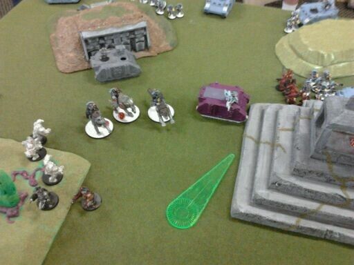 I move 2 oblit squads in on the left flank to get in the area terrain and use it as a fire base. The third oblit unit takes up a firing lane in the ruins on the right flank. My 2nd prince advances up behind the pyramid and I put a plague marine squad on each flank and have the berzerkers advance in the middle. My rhino in the middle moves up 6 1/4" up and my daemon prince moves in behind it. Let see if we can lure those dogs out ahead of the main force.