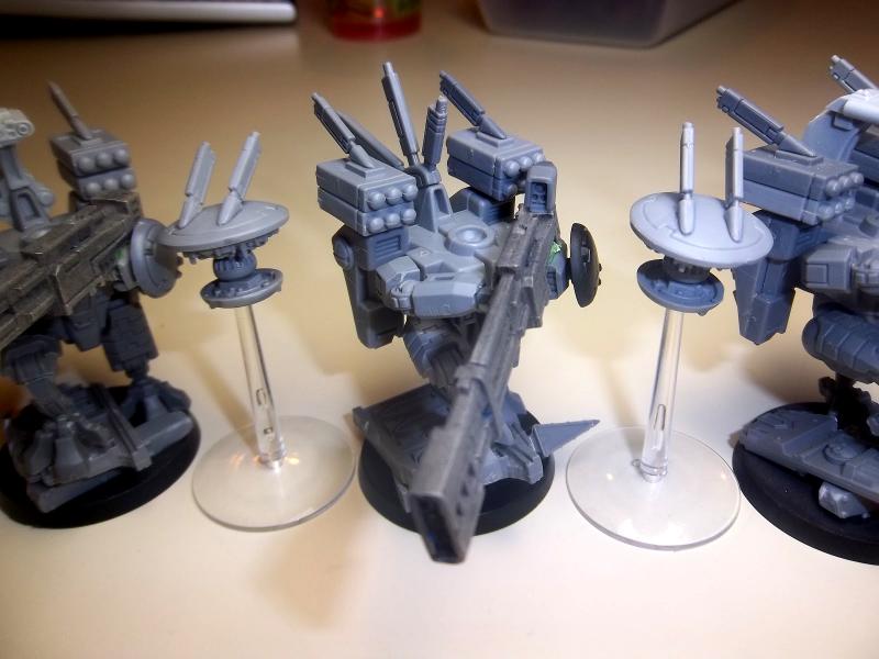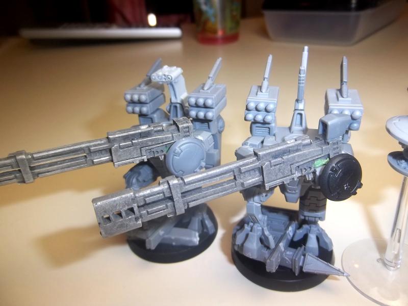 The broadsides have also had their legs repositioned for a more dynamic firing stance. The SMS systems are made from the Hammerhead SMS with gun drone sensors on top. I also used the FW marker lights to represent Target Locks.