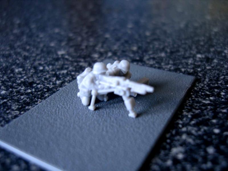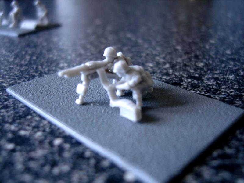 HMG gunner and one of the observers (see below) are made of three parts, including the backpack part. If not careful enough, these backpacks could be messed up, since each of them fits only on one particular model, although they look the same. The instruction sheet describes the 8cm mortar assembly with two crewmen, the