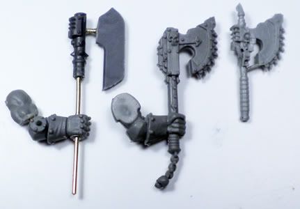 After much fuss and digging through bits boxes and boxes full of untouched sprues, I think I came up with something that will work for the much revered axe of Khârn: