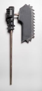 On the left is Gorechild, then a regular 'Zerker chain axe, and finally a Forge World chain axe. I think it's a good balance of size for the axe and length for the haft to believe that it could have been wielded by a Primarch, once upon a time. I know it's very "in progress" right now(and toothless), but it gets the idea across, yeah?