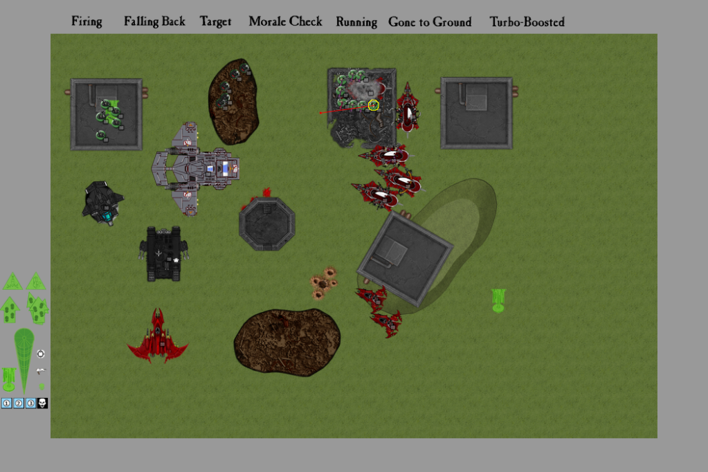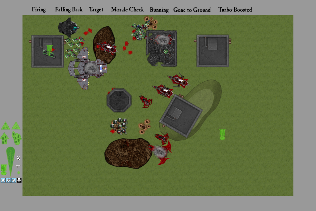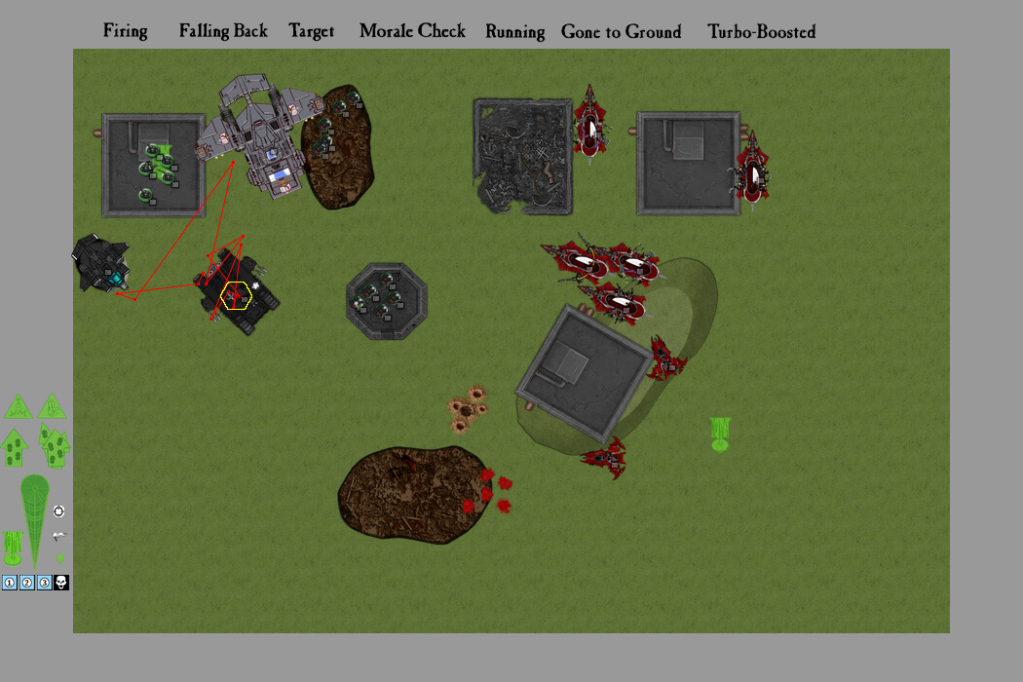 ...and nine dark lance shots later, I had only managed to stun the Land Raider. Of all those shots, I think only three even hit their targets. After resisting the urge to grab a garlic press and show my dice the penalty for failure, I focused on some squishier targets. Both Venoms and one of the Truborn squads all unloaded into the Combat Squad in the bunker, killing four of them. The last Seeker took a deep breath of relief, and was about to do a happy dance before the Warriors fired from their Raider, perforating him with splinters and earning themselves a juicy Pain Token.