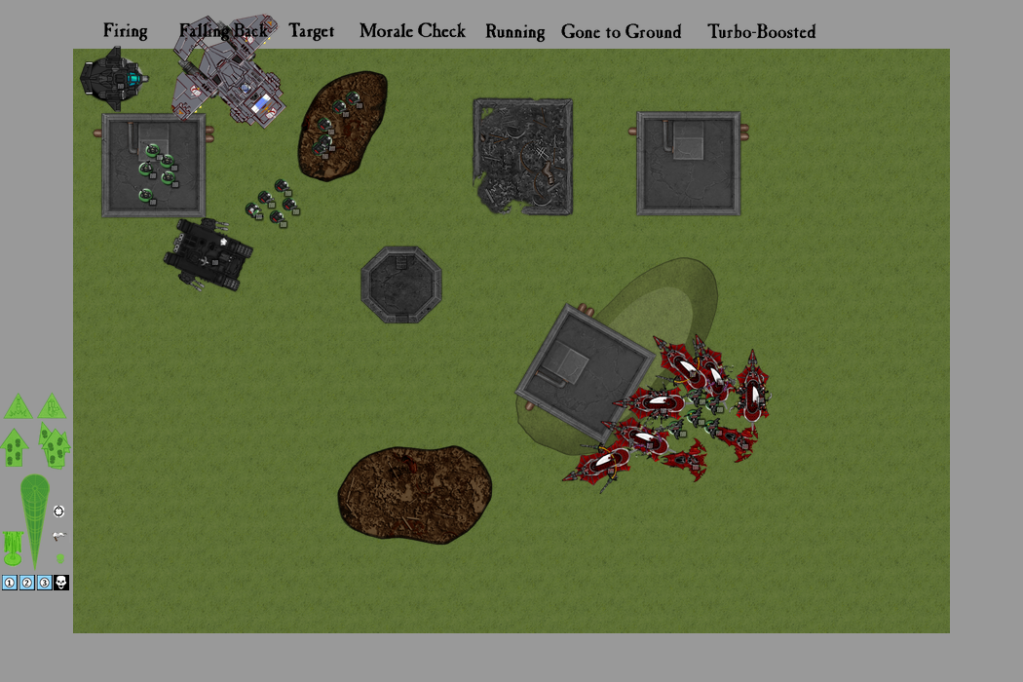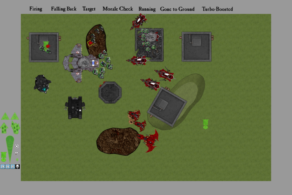 With their fancy Forge World ride having been wrecked, Mikkol and his fearsome Terminator Deathstar advanced towards the ruins, intent on squishing some pointy-eared opponents, while the Land Raider zoomed at full speed towards the retreating Razorwing. The Storm Talon edged around to face my swarm of Raiders, and the Land Speeder Storm...once again failed to show up, much to my opponent’s annoyance. The remaining Combat Squad, however, abandoned their positions and ran back towards their home bastion...for some reason. I mean, it’s not like their missile launcher was useless or anything.