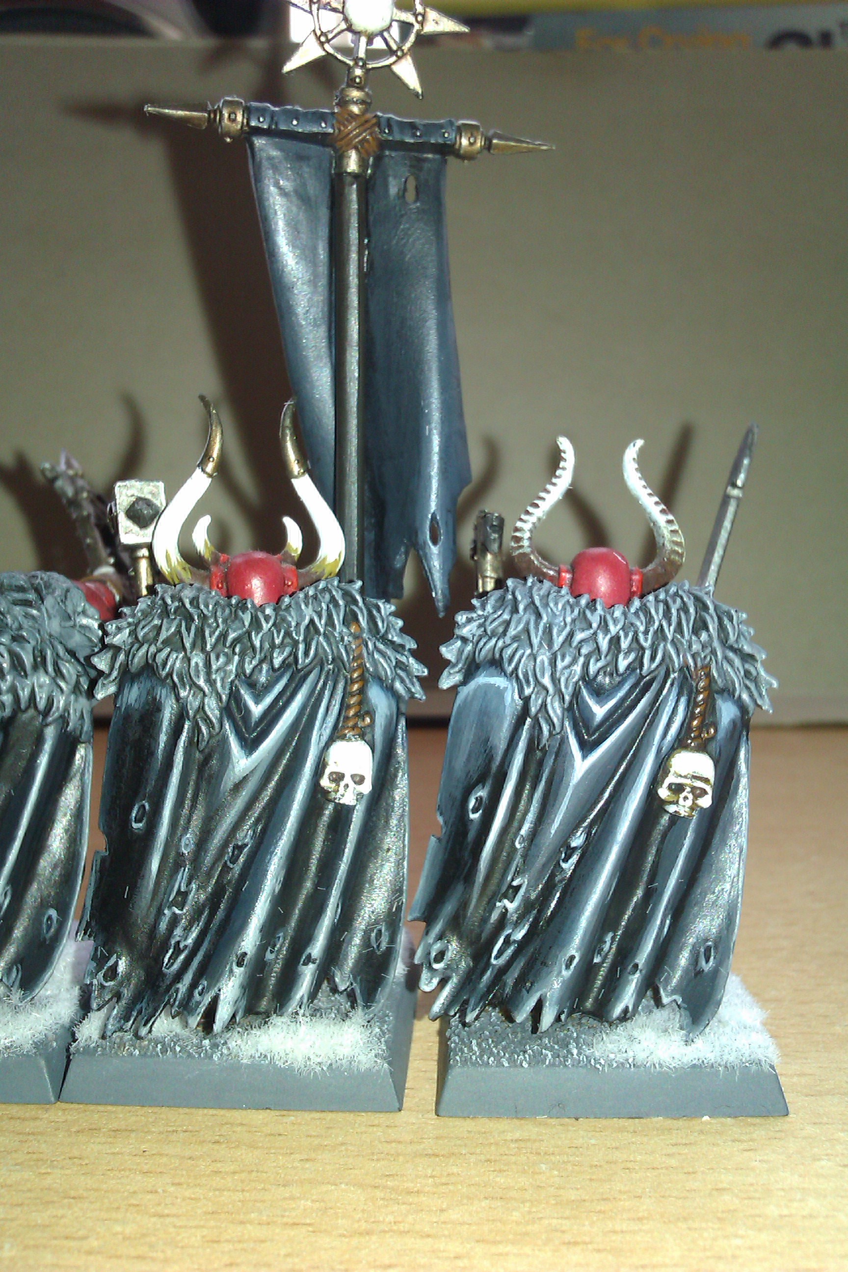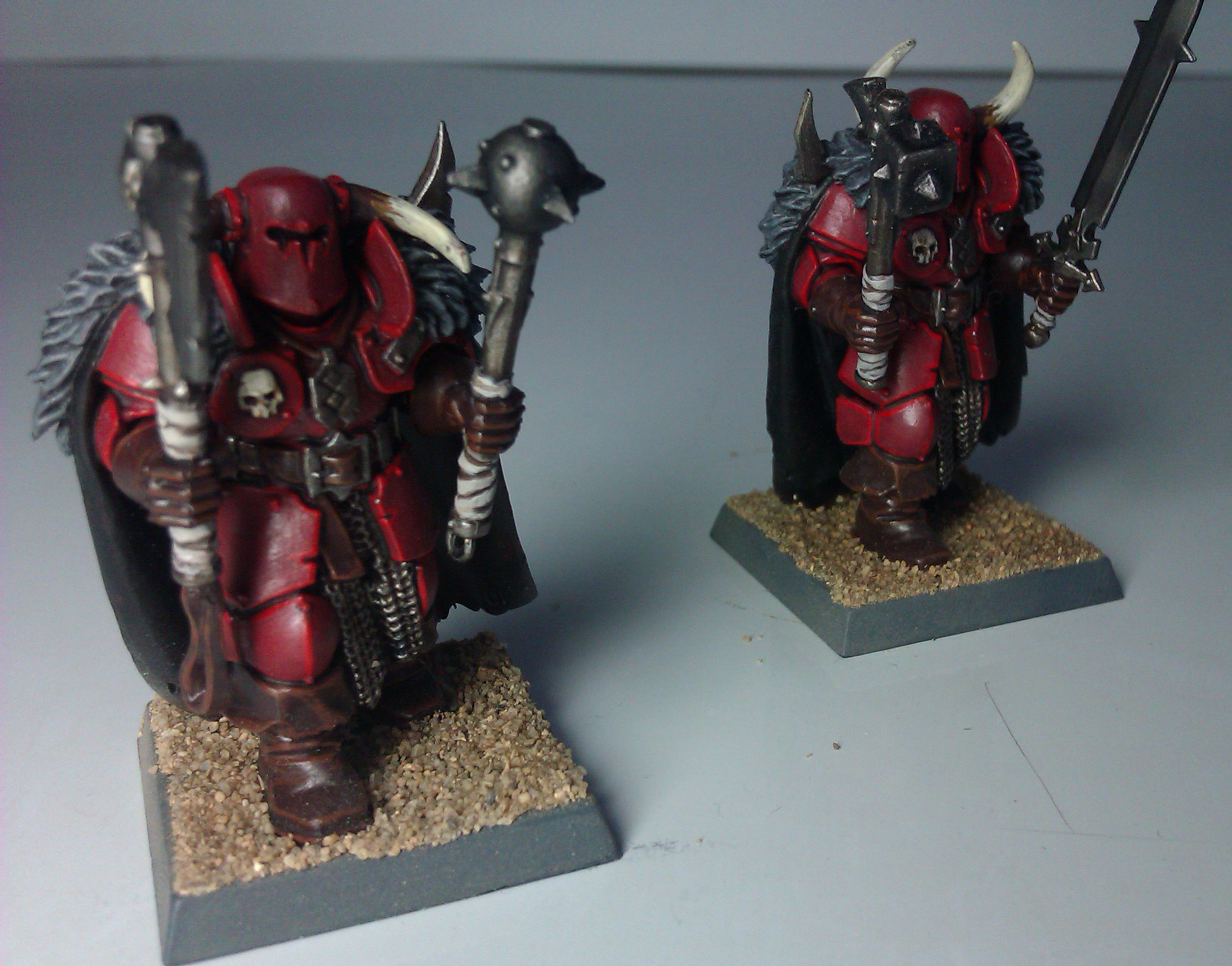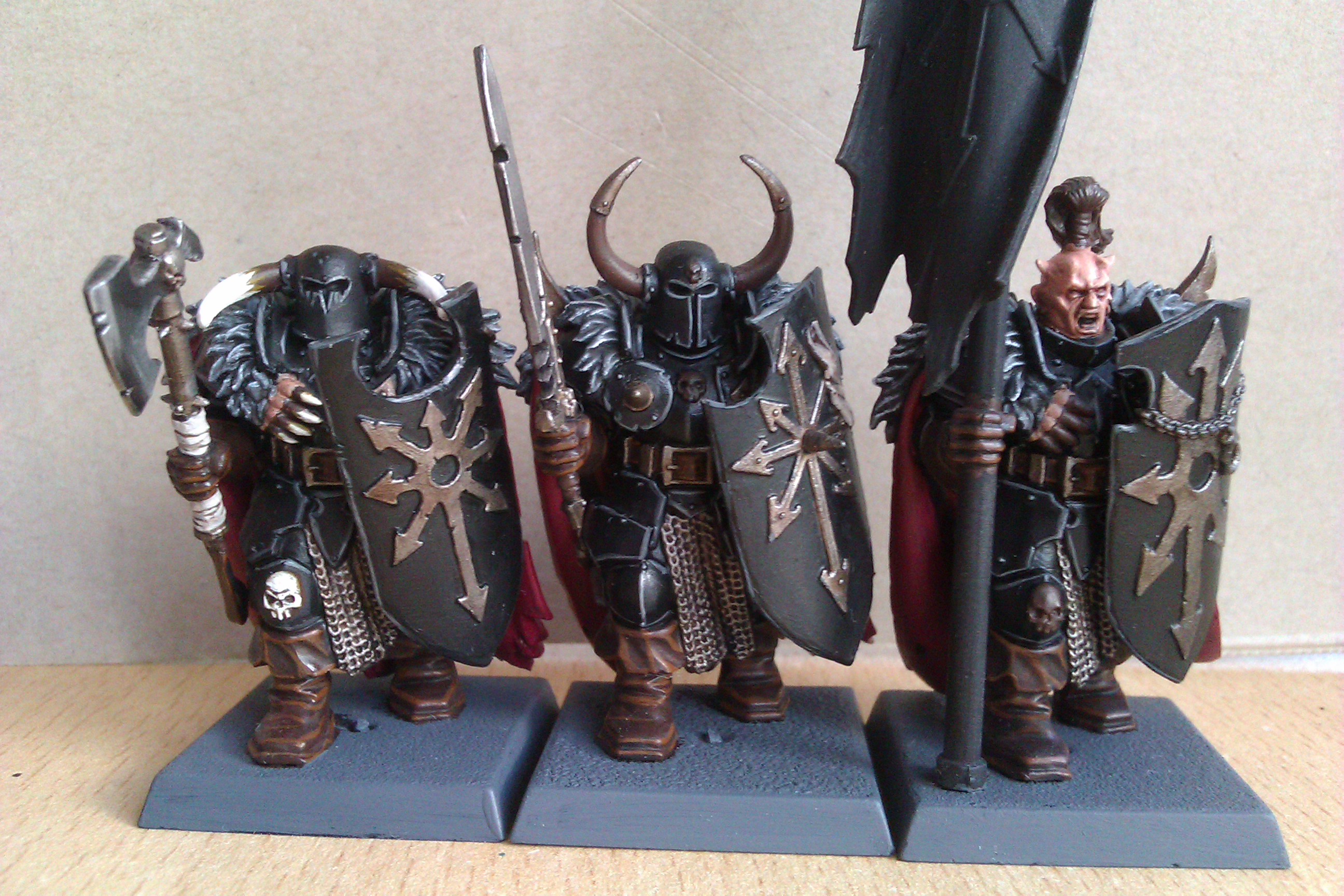 A quick comparison between Marked and Undivided units. To keep a uniform look to the army all elements of the models share the same colours with simple variation with the armour and cloaks. Undivided units have black armour with red cloaks while marked units have black cloaks with either red (Khorne), purple (Slaanesh), green (Nurgle) or blue (Tzeentch) armour.