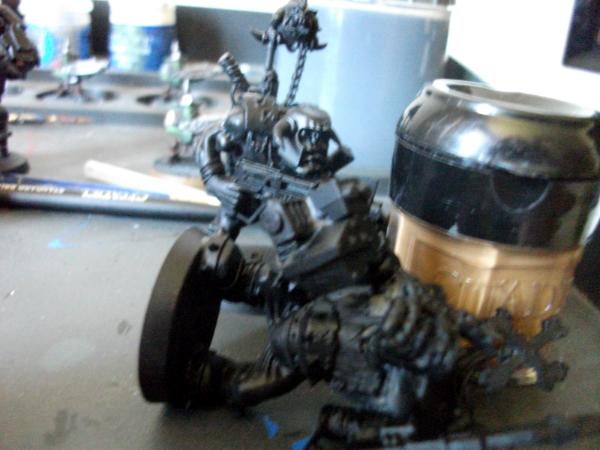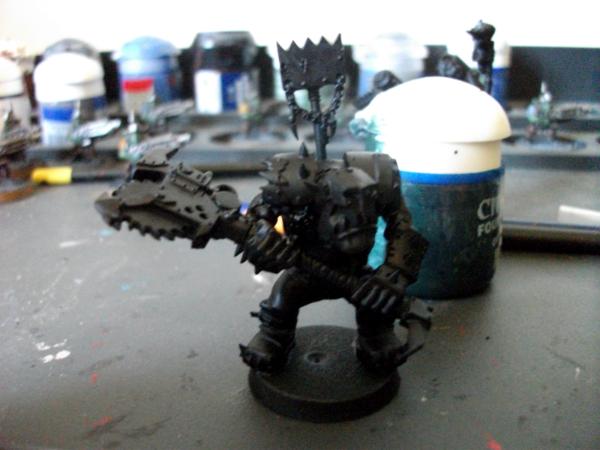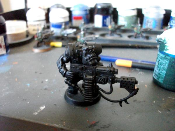 This is a close up of the same nob, showing the wrist mounted slugga. To make this I got a power klaw, got rid of all the claws and wires, then i stuck on a slugga and next to it the power box from the kombi rokkit